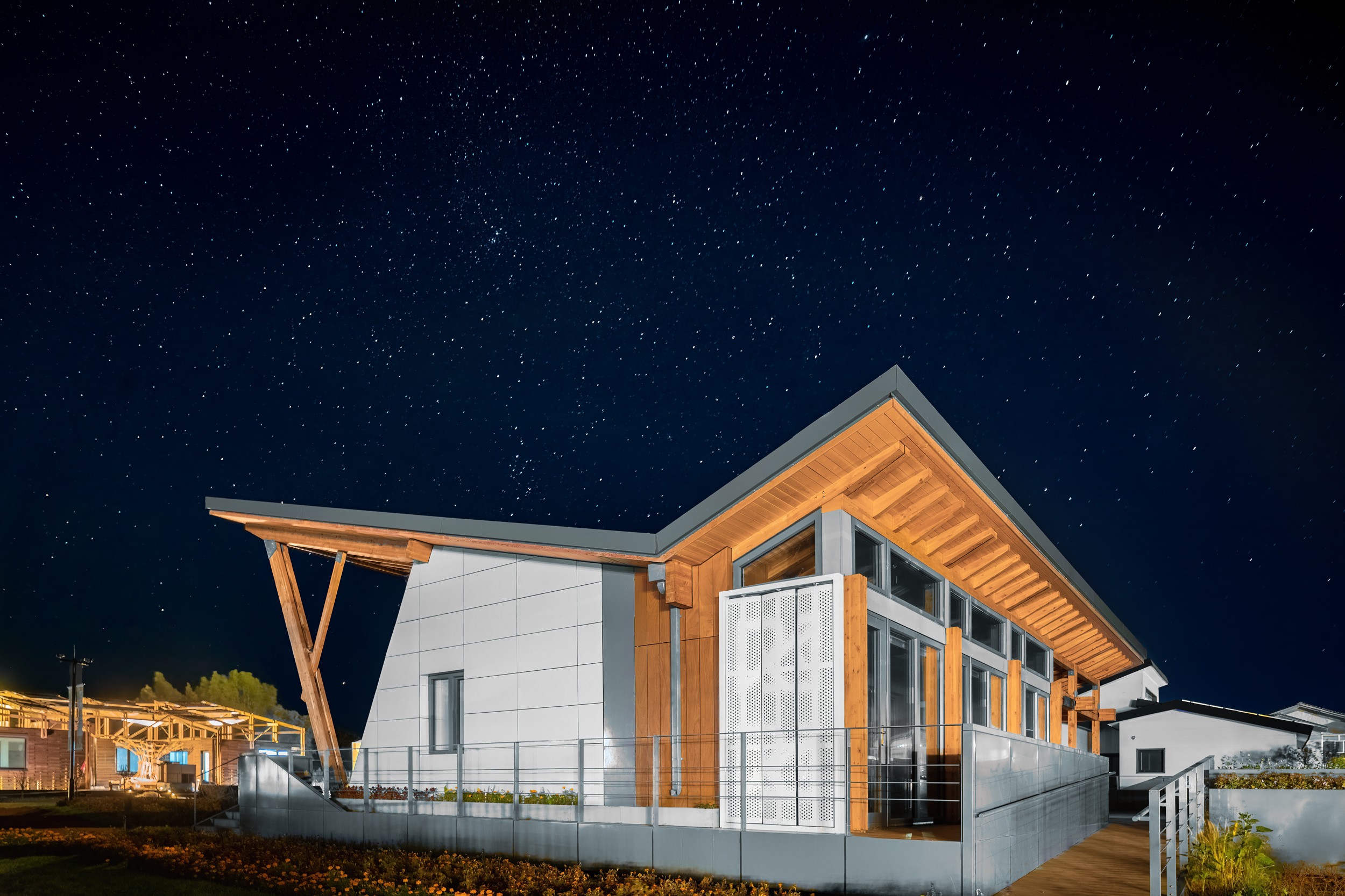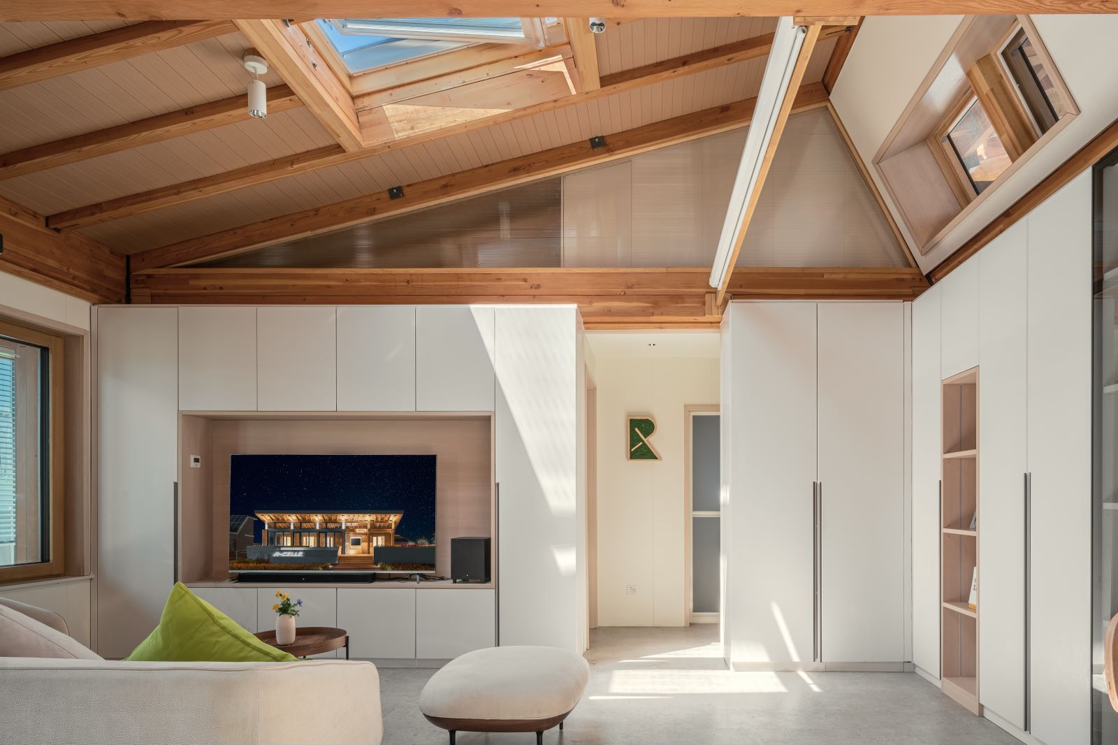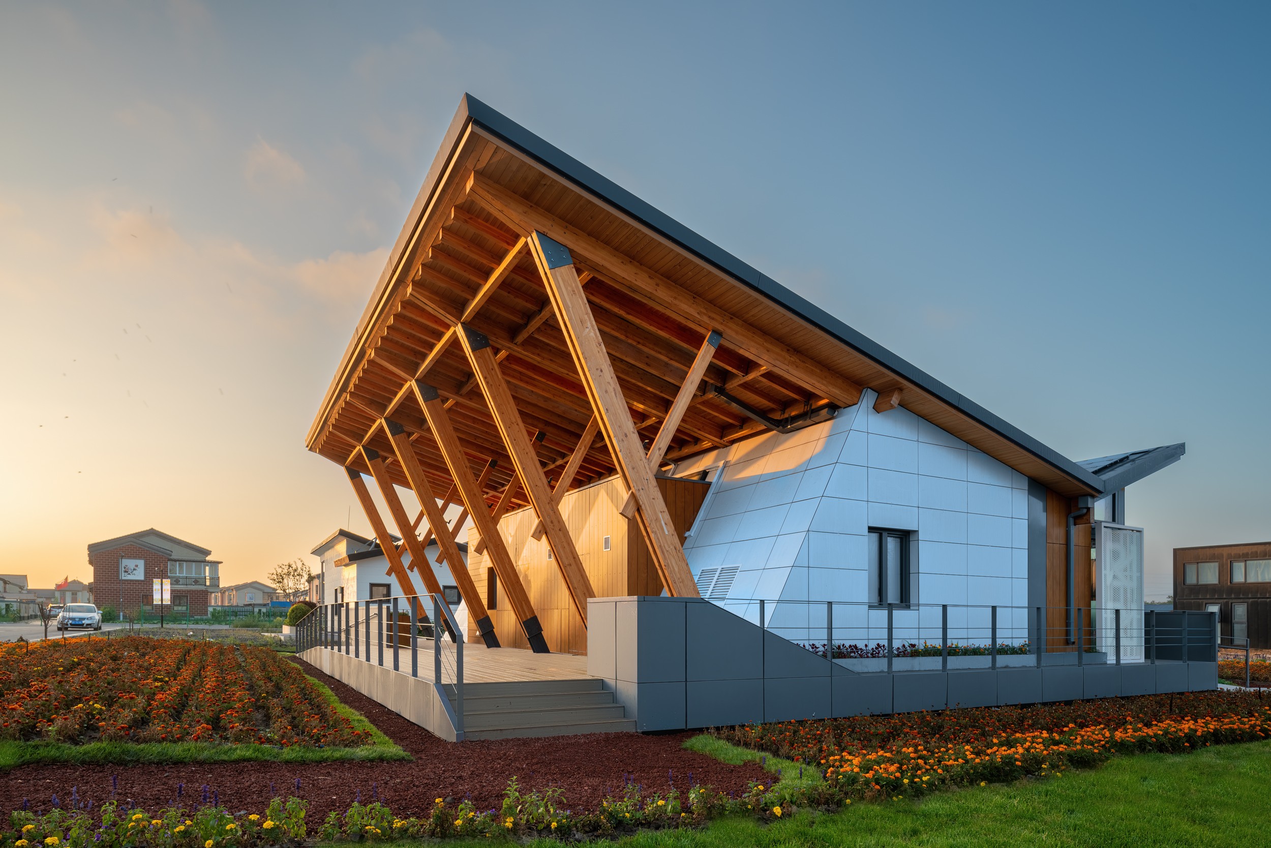 R-CELLS采用重木加輕木的混合結(jié)構(gòu)體系,木結(jié)構(gòu)建筑含碳低,固碳能力高,符合國家雙碳戰(zhàn)略。結(jié)構(gòu)選材以木材、金屬等生產(chǎn)加工對環(huán)境影響小或回收效益高的材料為主,包括初建、替換和拆除階段在內(nèi)的物化碳排放較小。R-CELLS采用預制+定制組合模塊的設計,可根據(jù)使用者的需求狀況進行模塊功能組合,張家口賽場建造周期二十天,從基礎到主體再到內(nèi)裝全部采用裝配式。