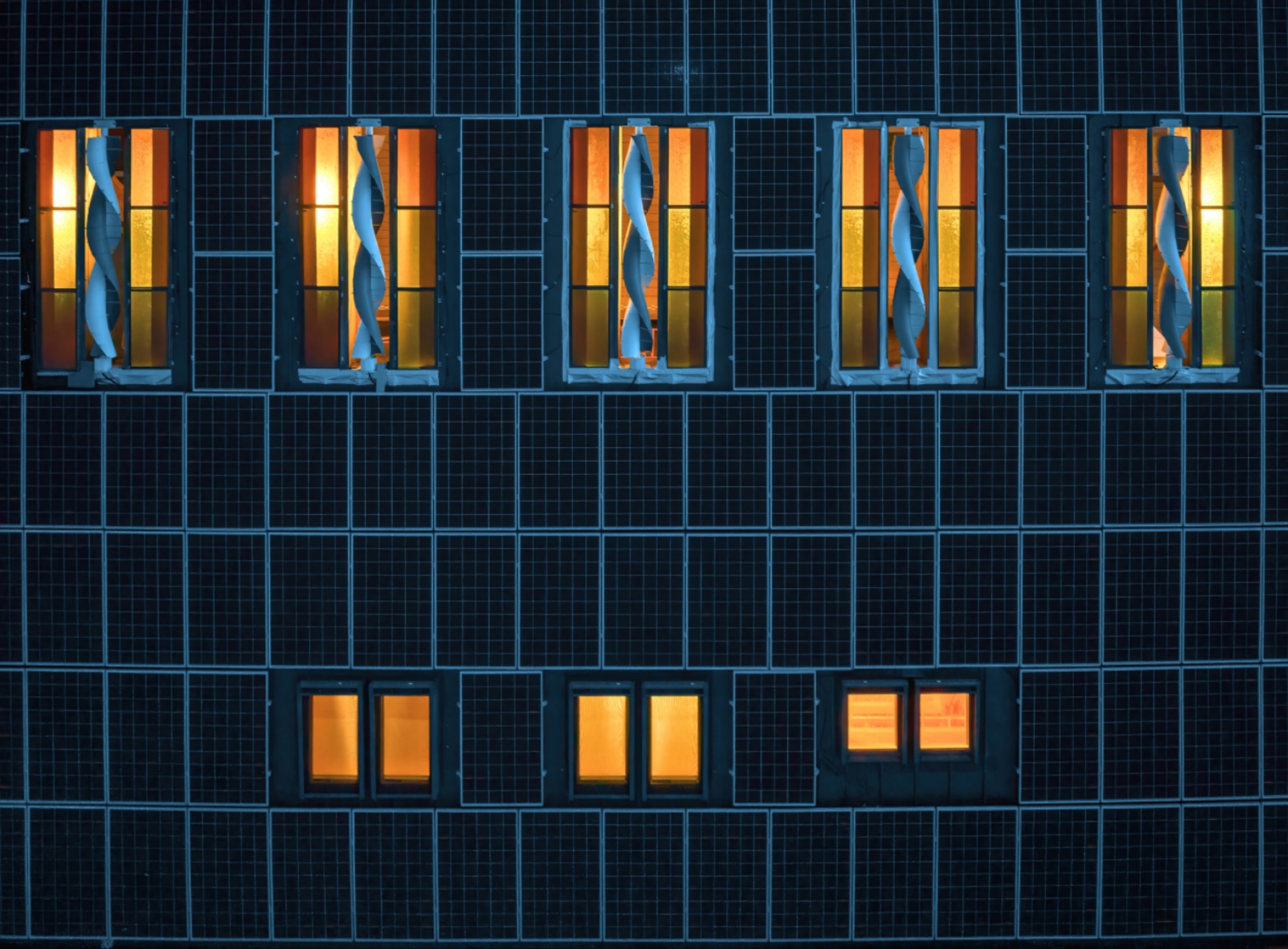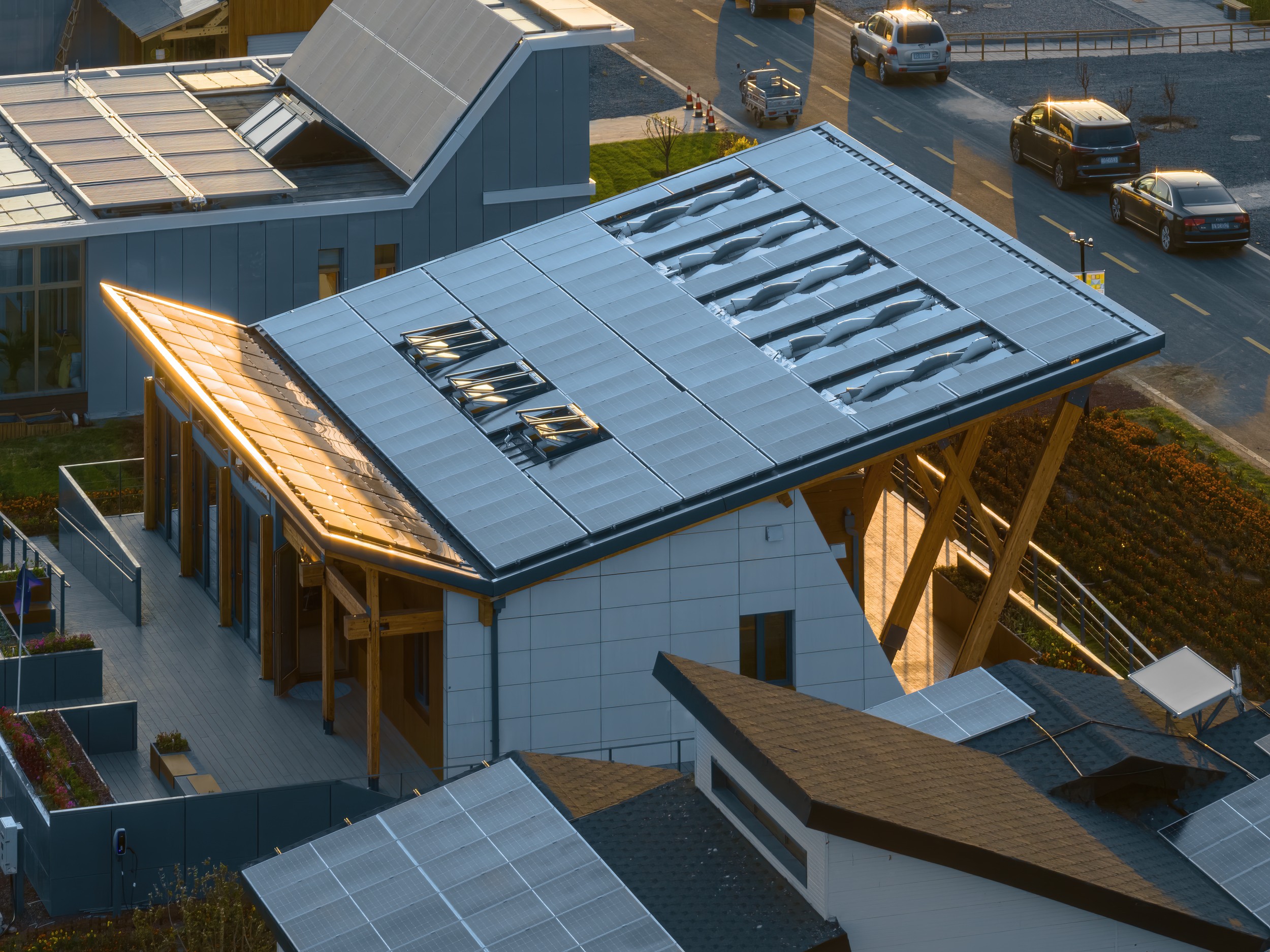 R-CELLS電能自給分成光伏發(fā)電、風電、和儲能電池三部分。太陽能光伏組件采用單晶硅PV、單晶硅PVT、薄膜采光頂和薄膜光伏的組合,光伏板美觀度較高,視覺上整齊明亮,與屋面融合度較高。風力發(fā)電方面,為降低風荷載,屋面迎風面開了5個約3*0.5米的孔,巧妙地安裝五臺螺旋式風車發(fā)電裝置,隨風轉(zhuǎn)動的螺旋風車在屋面形成一道美麗的風景線,視覺效果十分亮眼。