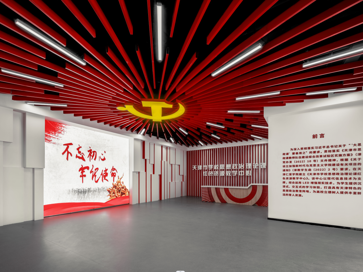 天津市學校思想政治理論課紅色資源教學中心包括3個展區:百年黨史時空隧道、二十大展廳、精神譜系多媒體教育教室。