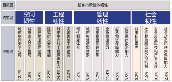 在韌性評(píng)價(jià)系統(tǒng)構(gòu)建方面,對(duì)標(biāo)《國(guó)土空間規(guī)劃城市體檢評(píng)估規(guī)程》和《建設(shè)部2020年城市體檢》,從“空間、工程、管理和社會(huì)”四維度構(gòu)建新鄉(xiāng)市韌性防災(zāi)評(píng)價(jià)體系,推動(dòng)安全系統(tǒng)從傳統(tǒng)工程防御向綜合功能保障的重大轉(zhuǎn)變。
