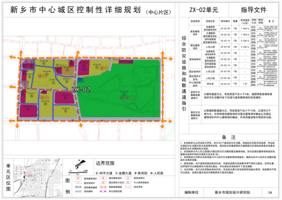 為進(jìn)一步增強(qiáng)防災(zāi)設(shè)施的落地性和規(guī)劃的可實(shí)施性,規(guī)劃選取中心城區(qū)ZX-02控規(guī)單元編制“綜合防災(zāi)技術(shù)圖則”,從“性、量、位、質(zhì)”四個(gè)層面實(shí)現(xiàn)控規(guī)單元防災(zāi)設(shè)施的圖則標(biāo)定示范。