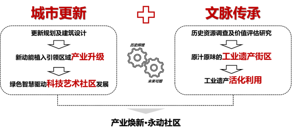通過更新改造,一方面在文脈傳承角度打造原汁原味的工業遺產街區,最大化保護工業遺存,堅持文化保護和生態保護一體聯動,打造歷史文化復興的老廠區更新樣板工程;一方面在城市更新角度引入新動能,立足建設都市產業公園,匯聚創新人才,打造以智能科技、數字經濟、工業設計為核心的制造業立市煥新基地,在注入新建筑新產業的同時,新建住宅及配套服務設施,打造宜居都市生活區,從而延續城市工業歷史文脈,帶動區域產業轉型升級。