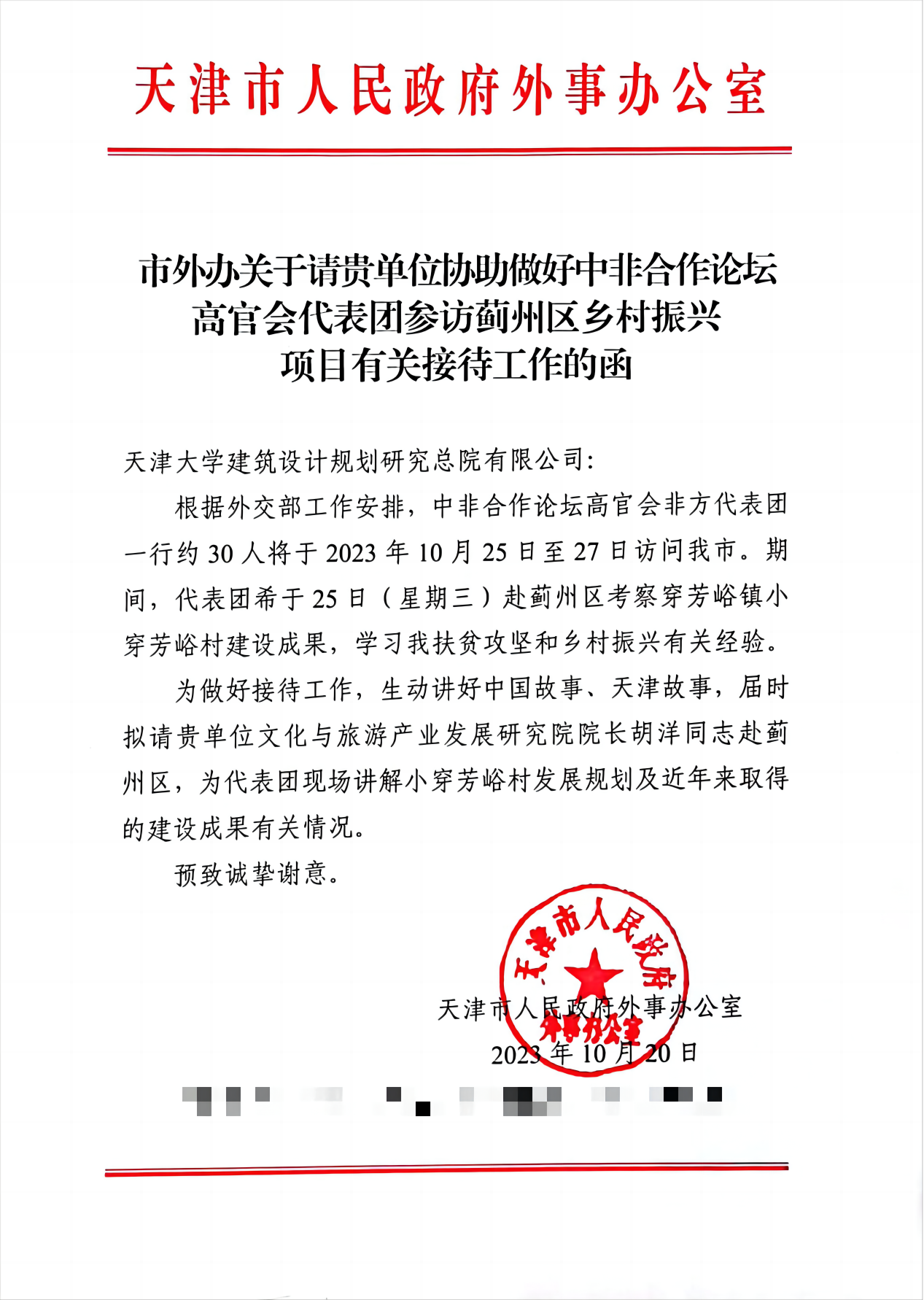 1025日,出席中非合作論壇第十六屆高官會的非方團(tuán)長代表團(tuán)一行23人訪問天津,專程考察鄉(xiāng)村振興示范村薊州區(qū)芳峪鎮(zhèn)小穿芳峪村,了解中國脫貧攻堅的成果與鄉(xiāng)村振興經(jīng)驗,外交部非洲司司長吳鵬陪同來津。