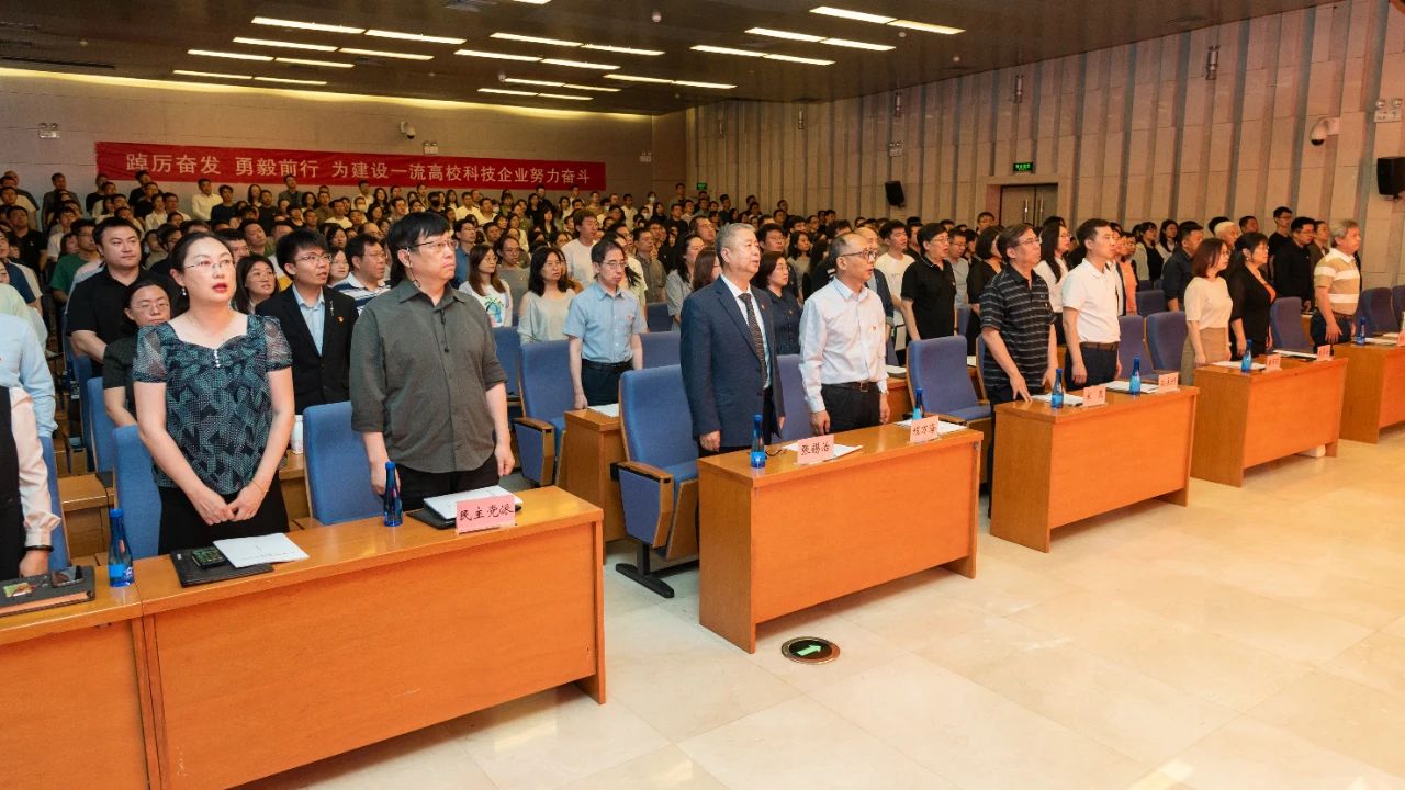 大會現場氣氛莊嚴熱烈,報告廳后方正中懸掛“踔厲奮發 勇毅前行 為建設一流高校科技企業努力奮斗”橫幅標語。會議在雄壯的國歌聲中開幕。