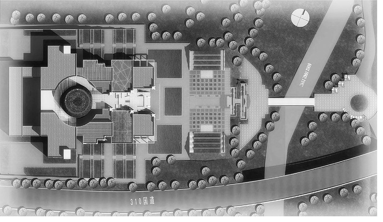 覆土建筑:黃土是陜西地區常用的建筑材料,厚重的土坯墻體是當地的建筑特色之一。陜北窯洞是我國最早的覆土建筑。設計中運用這一元素,將博物院主體墻面設計為接近土坯墻的材質和色彩,比較封閉、厚重,并在覆土屋面上設置綠化,使建筑基座如黃土中生長出來一般自然質樸。