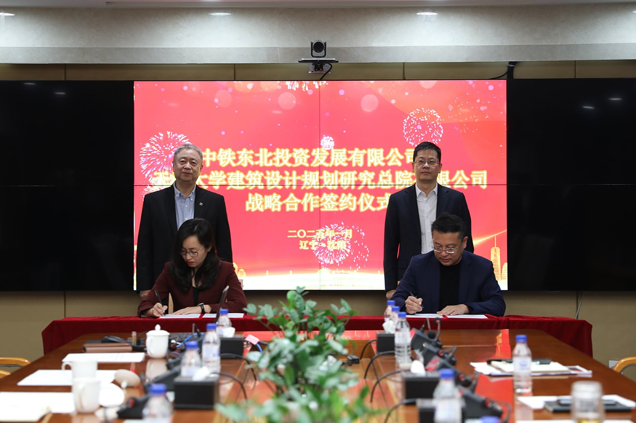 1月5日,天津大學建筑設計規劃研究總院有限公司(以下簡稱“天大設計總院”)與中鐵東北投資發展有限公司(以下簡稱“中鐵東北投資”)在沈陽舉行了戰略合作簽署儀式。中鐵東北投資總經理許俊峰,副總經理劉錫斌、李志,建設管理部部長林宏亮,天大設計總院黨委書記、董事長張錫治,副總經理賈莉,建筑學院教授、總院總規劃師袁大昌,建筑學院教授、總院總景觀師朱玲,副總建筑師、誠榀工作室總監滑際珂,市場經營部總監張敬等相關負責人出席會談和儀式,共同見證這一重要時刻。