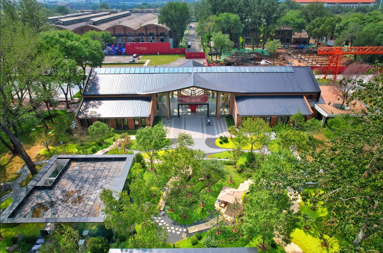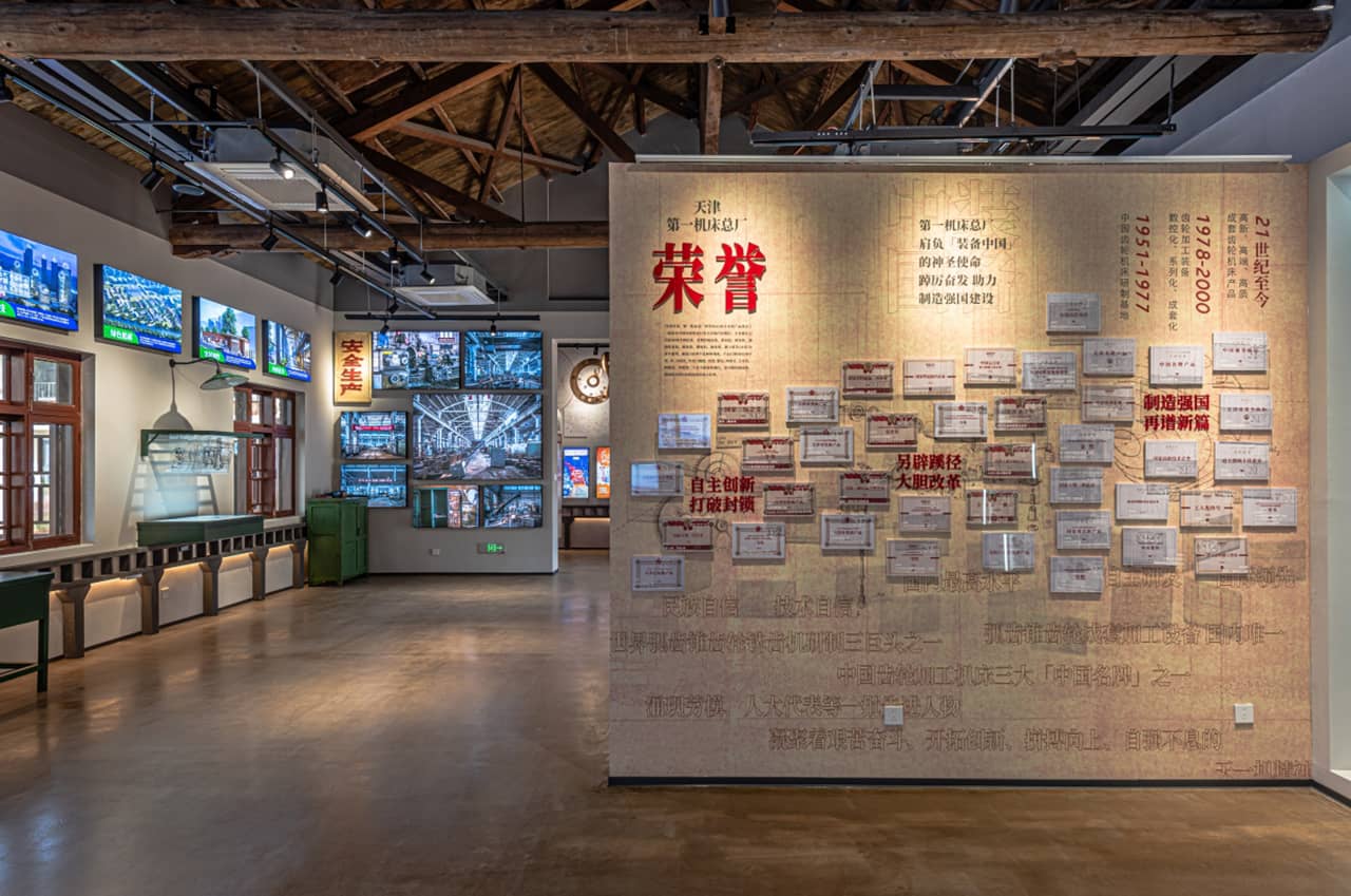 天津第一機床總廠始建于1951年,曾是中國齒輪機床行業的領軍企業,承載著天津工業發展的輝煌記憶。自2022年開始啟動城市更新工程建設,設計總院團隊以一磚一瓦一草一木的耐心保留老廠房、綠地及工業肌理,將紅磚廠房、挑高車間與月牙河畔景觀有機融合。如今,園區內閑置的老廠房、舊設備逐漸“蘇醒”,藍天映襯下的紅磚建筑群工業氣息濃郁,津一廠史館陳列的泛黃照片、珍貴零件設備,無聲講述天津工業文化脈絡;津一會客廳內,咖啡香氣與機械結構美學交織,重現“共和國機床十八羅漢”的輝煌故事。
