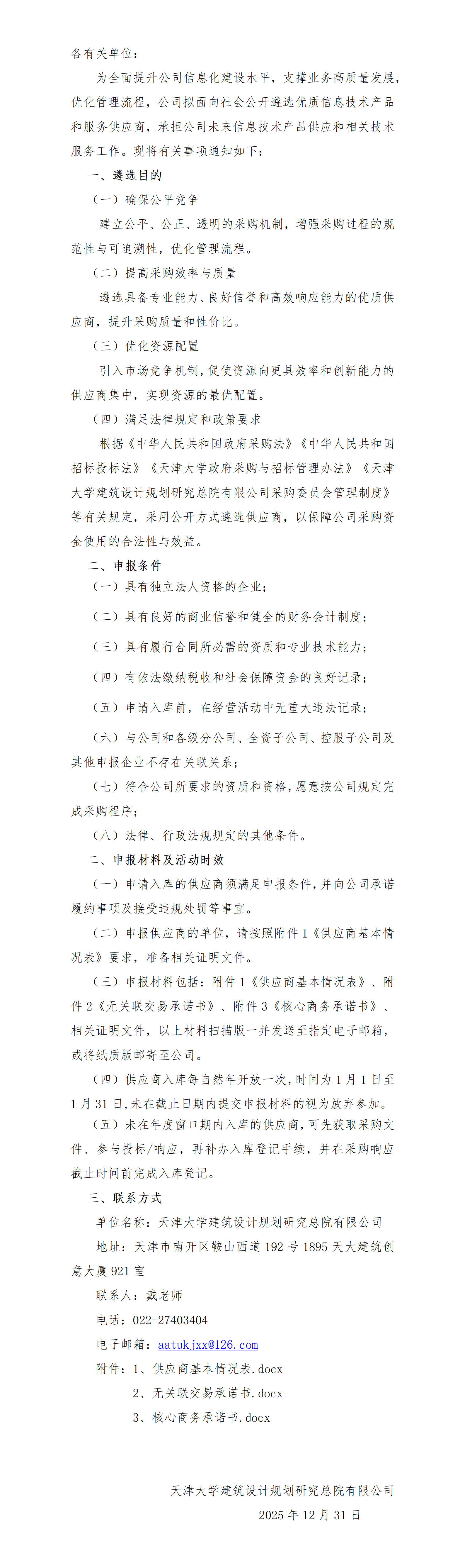 天津大學(xué)建筑設(shè)計(jì)規(guī)劃研究總院有限公司關(guān)于遴選信息化供應(yīng)商的通知