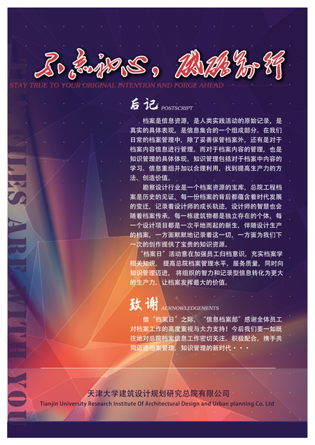 檔案是工程設計活動真實、全面的反映,設計成果是總院最寶貴的財富。作為知識管理的基礎性資源,檔案也是信息化建設的重要組成部分。總院將繼續加強歸檔工作的引導,持續推動信息化建設,助力總院從檔案數字化向知識管理信息化邁進,最大程度發揮檔案的價值。未來我們將繼續不懈努力、憑借著嚴謹的工作作風和良好的服務意識,不忘初心、砥礪前行。