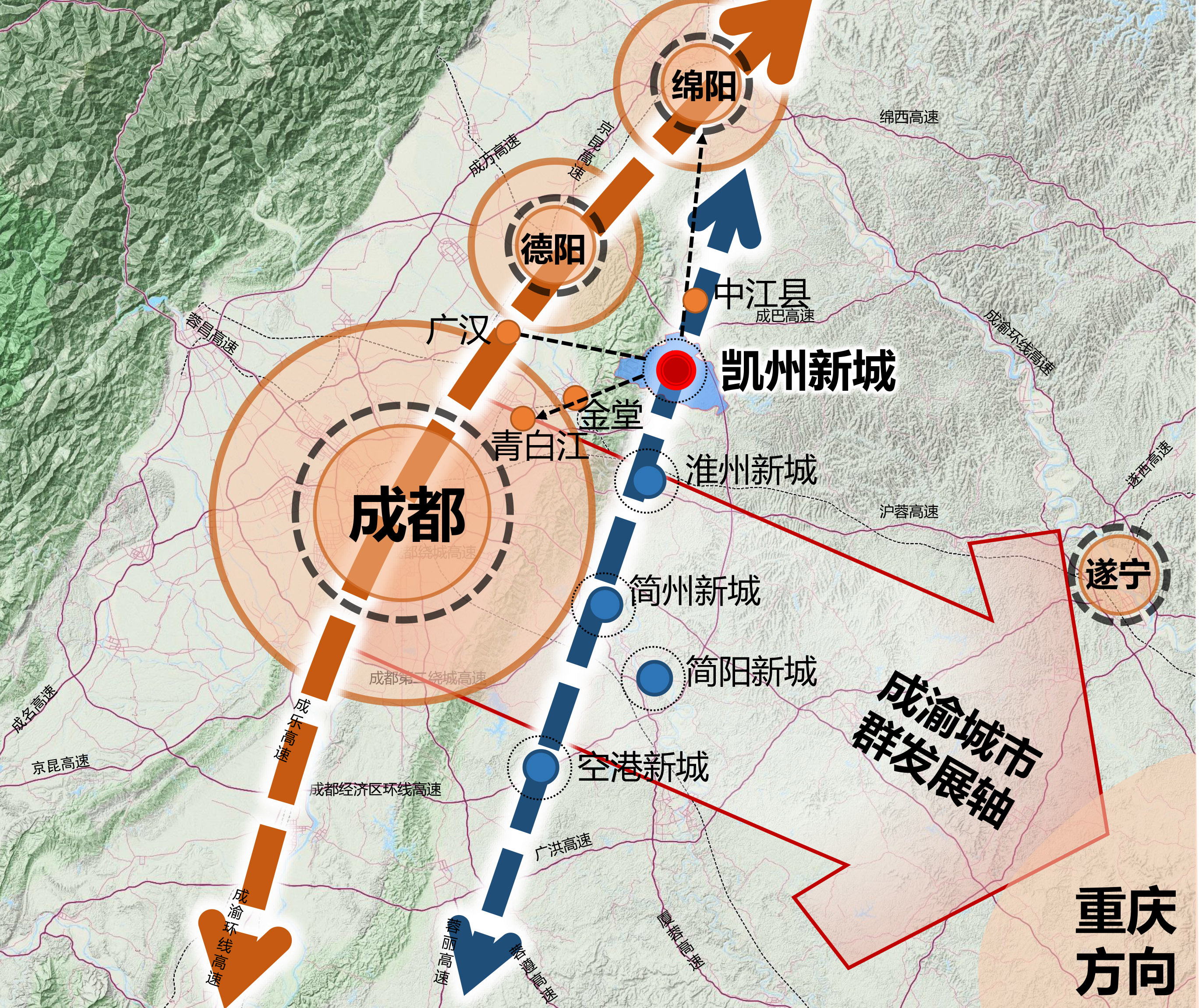 成渝城市群一體化發展上升至國家戰略,是成渝城市群的新優勢新戰略,成都、重慶迎來西南國際門戶重要發展機遇,建設成渝雙城經濟圈。德陽緊鄰成都,凱州新城臨近成渝發展軸北線,未來將融入成渝城市群,促進兩地相向發展,作為北線發展新支點。推動成都與環成都經濟圈協同發展,增強對四川省其他區域的引領輻射帶動能力。實施“一干多支”發展戰略,構建“一干多支、五區協同”區域發展新格局。凱州新城位于成都經濟圈帶動川東北區域發展的成巴高速發展軸上,便捷串聯起南充市、巴中市,是成都經濟圈輻射帶動川東北的中心城市。凱州新城對接成都“東進”戰略,與淮州新城、簡州新城、空港新城、簡陽新城等四大經濟單元對接,圍繞龍泉山城市森林公園,共同構建“六城一園”城市體系。成德同城化,成都與德陽統籌建設一體化。在產業協同、半小時交通圈、生態共治、基礎設施上,實現資源共享、統籌協作、優勢互補,提高區域經濟整體競爭力。凱州新城位于德陽半小時經濟圈、成都1小時經濟圈,是成德同城化的重要支撐。