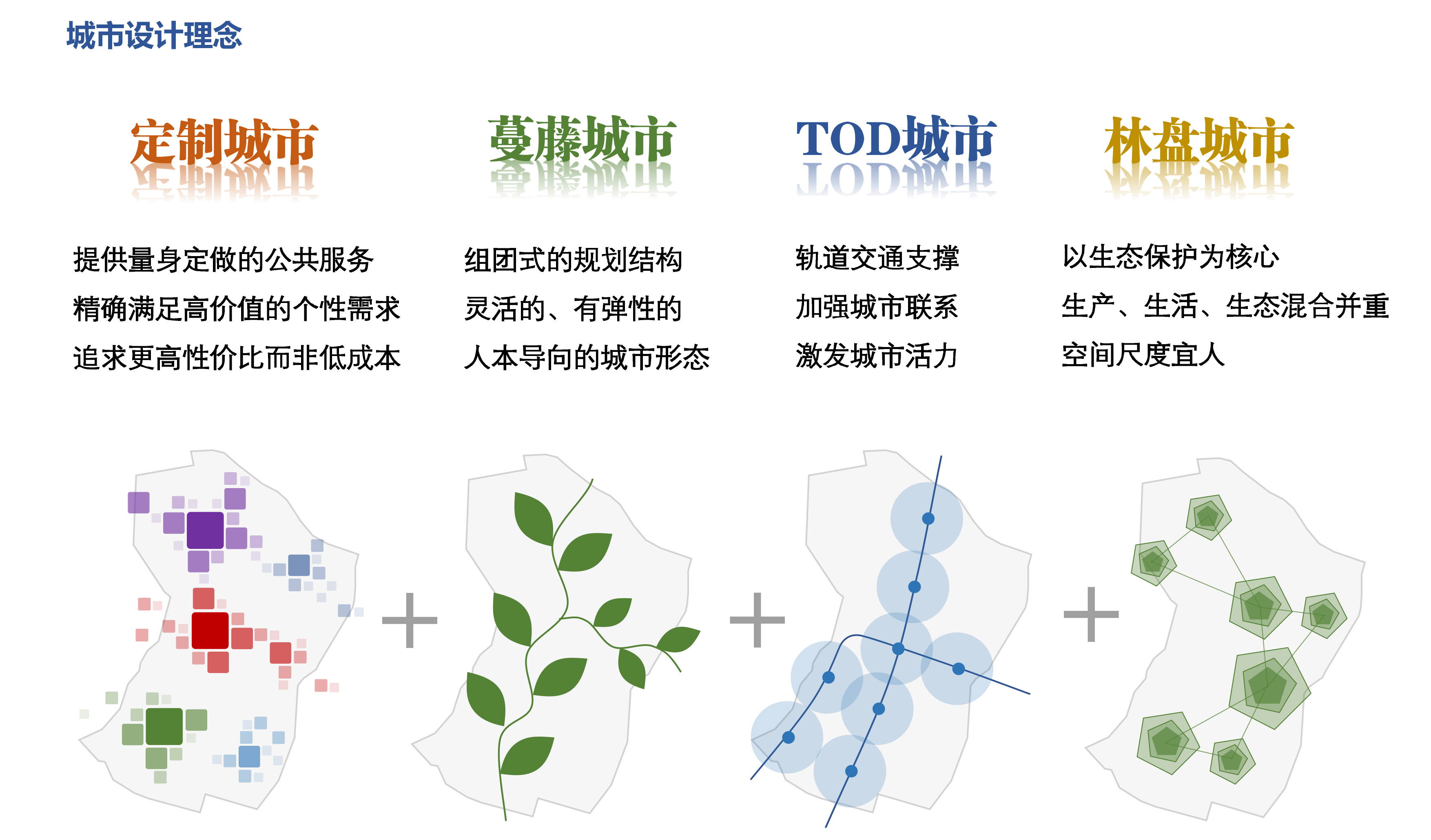 城市發展像蔓藤一樣,采取一種組團式的規劃結構,發展過程如同蔓藤生長一樣可持續,從單中心到多中心發展。蔓藤城市是靈活的、有彈性的,增加城市發展試錯的機會,并且以生態保護為核心,融入風景、保護田園。