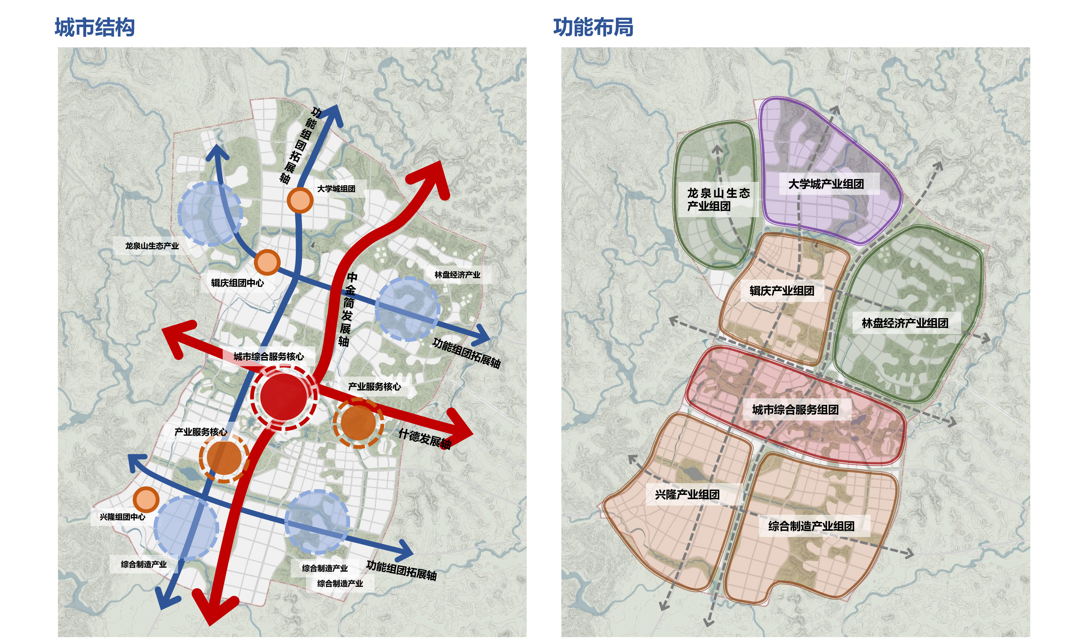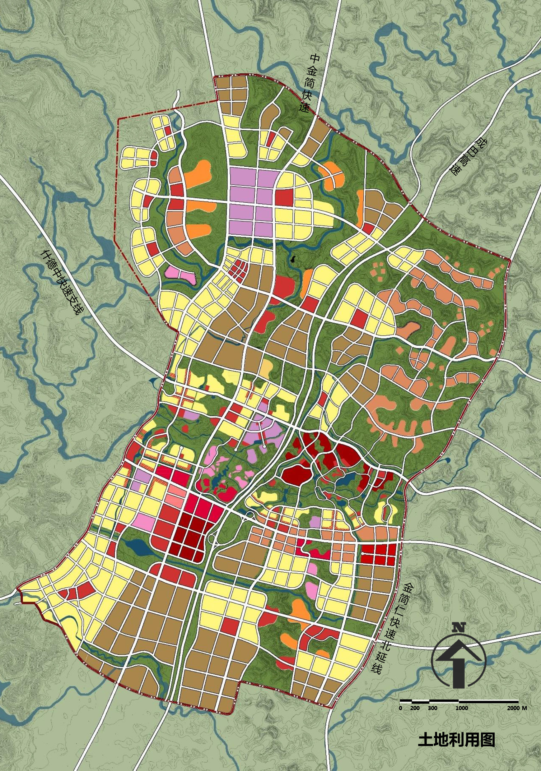 以城巴高速和什德中快速為骨架,以多條主干交通為發展路徑,城市以組團方式延伸發展,各個組團空間相對獨立,功能特色鮮明,最終形成藍綠交融、有機生長的蔓藤城市風貌。