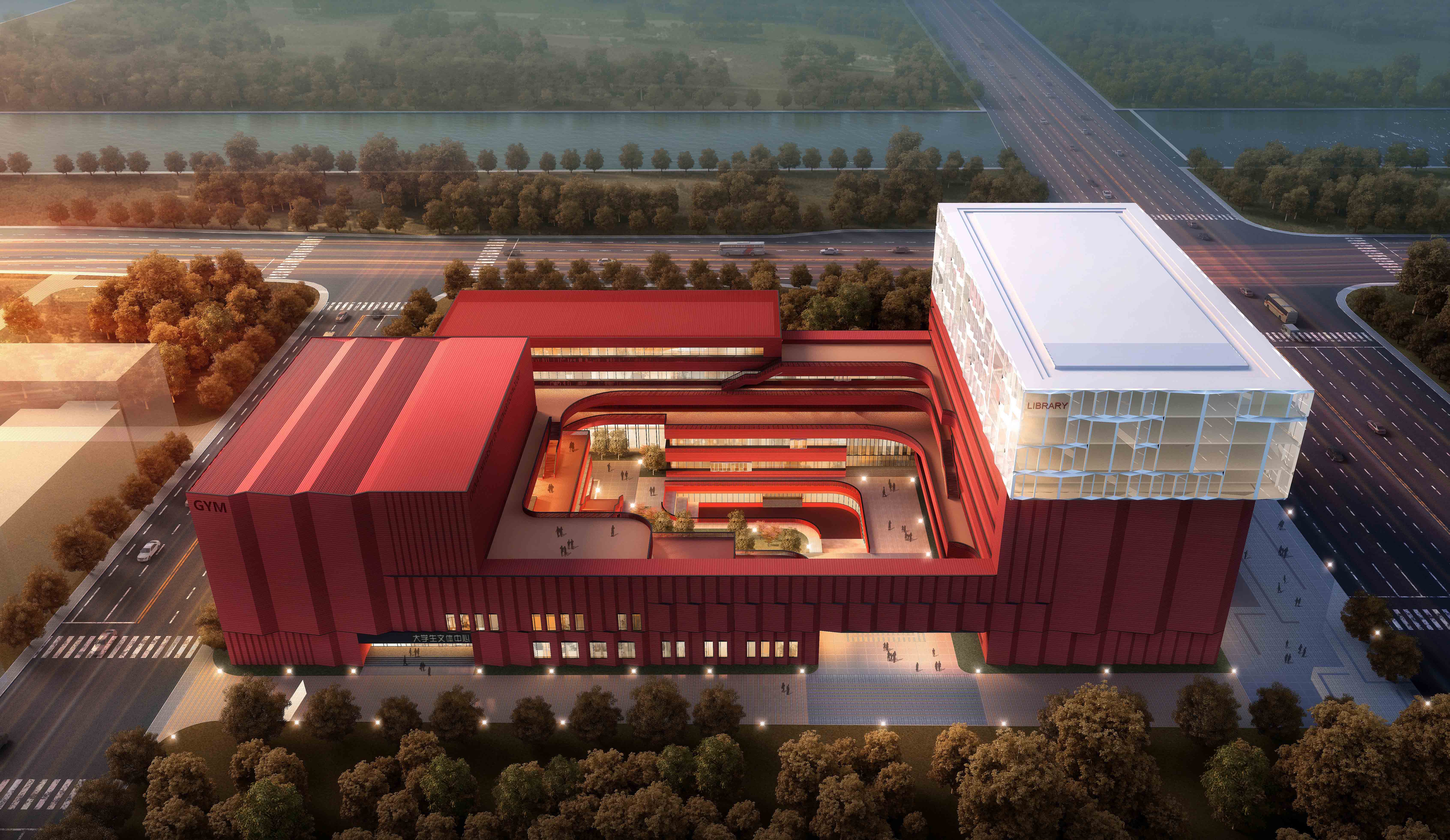 具有“礦坑”意向的活力庭院采用層層跌落的設(shè)計(jì)手法,把綜合實(shí)驗(yàn)樓的各個(gè)功能聯(lián)系整合,形成了集約科學(xué)的智慧山谷,圖書館置于綜合樓的頂部,具有最安靜和最佳的景觀視線,眺望整個(gè)校園,并成為標(biāo)志性建筑,營造礦學(xué)高峰。