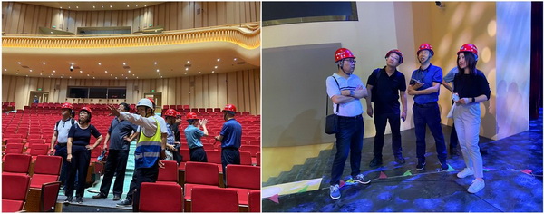 寶雞大劇院項目技術難度大、施工工期短,因此本次技術性回訪以工程施工及設備安裝為重點,全面審視設計的深度和品質??値焾F隊在總包單位的帶領下,考察了劇院整體建設及施工情況,隨后仔細查看了大劇場、多功能廳、屋頂幕墻、舞臺系統、設備系統等施工及安裝情況,并就項目局部細節的完善提升與總包單位進行交流和探討。