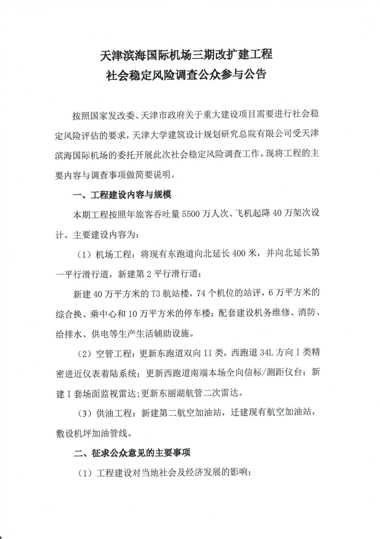 天津濱海機場三期改擴建工程社會穩定風險調查公眾參與公告