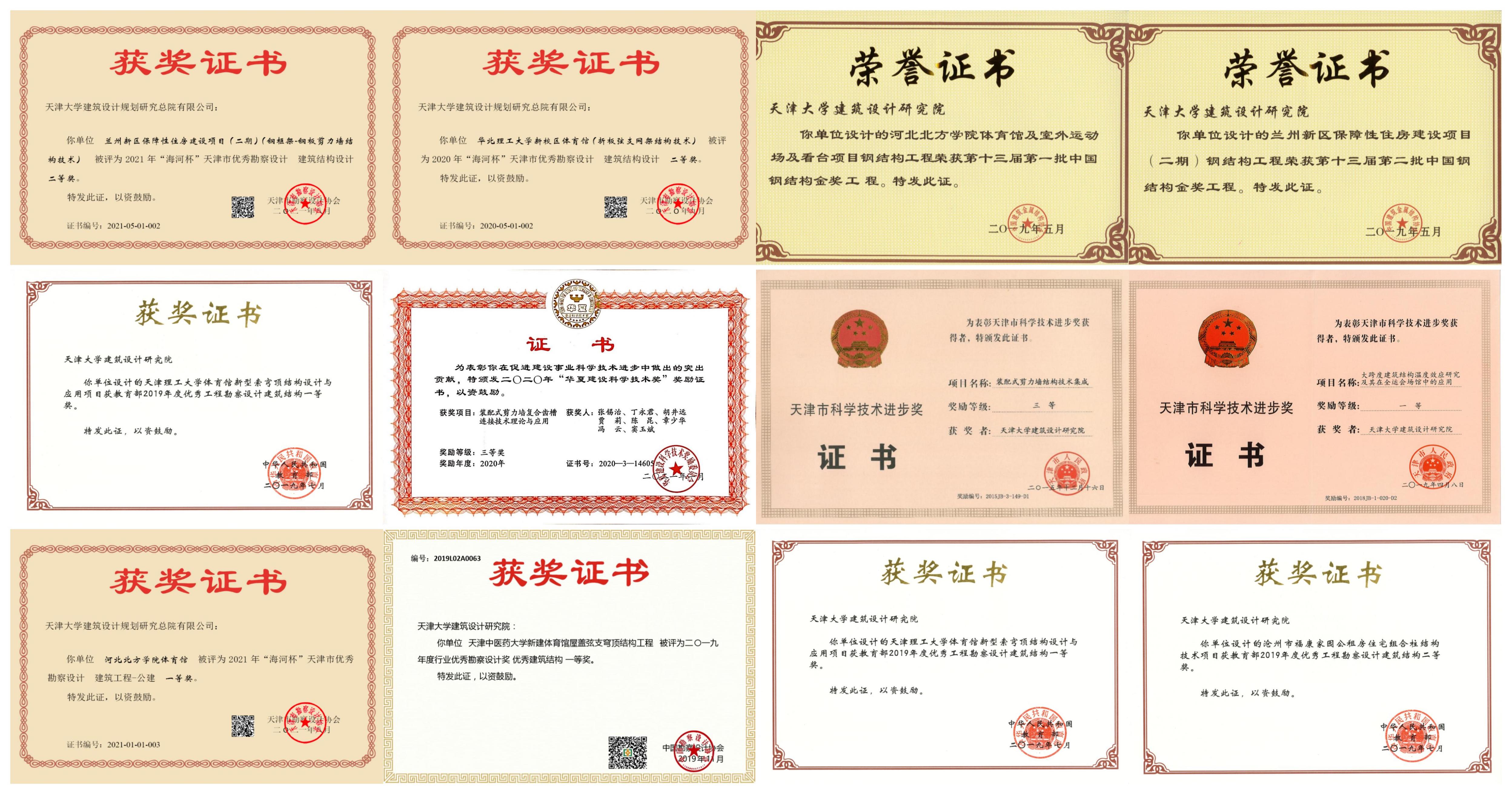 獲得省部級科技進步獎3項,行業優秀設計獎勵一等獎2項、二等獎4項、三等獎1項,省部級優秀設計獎勵一等獎10項、二等獎7項、三等獎5項,中國鋼結構金獎10余項: