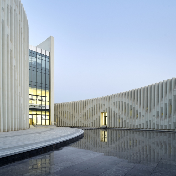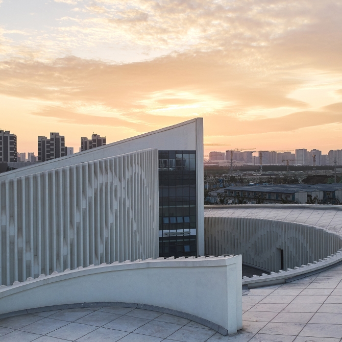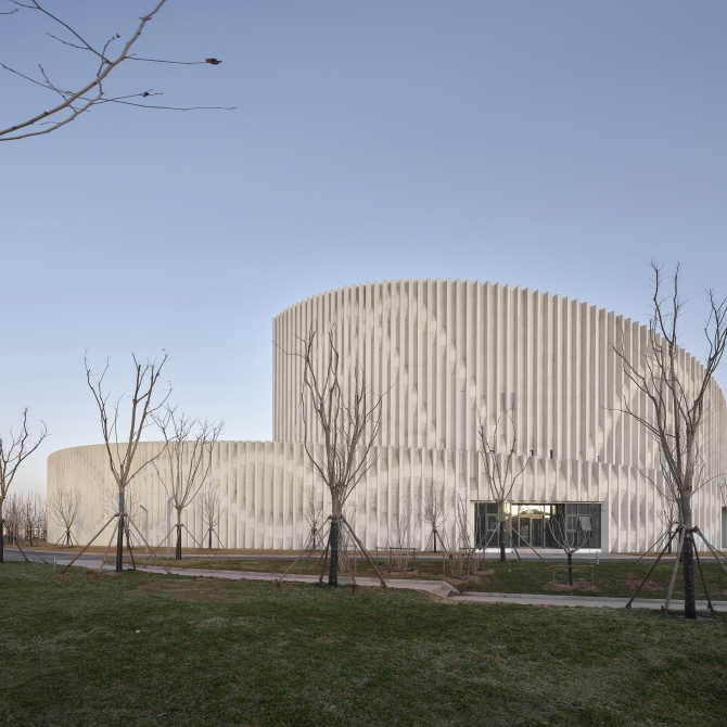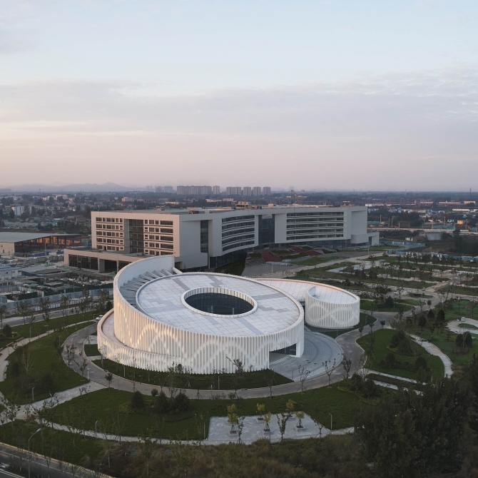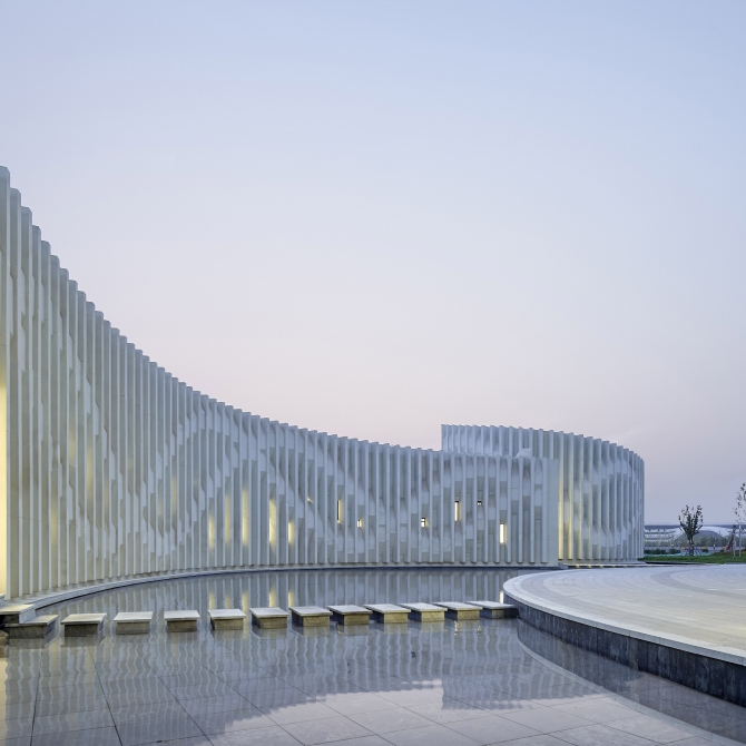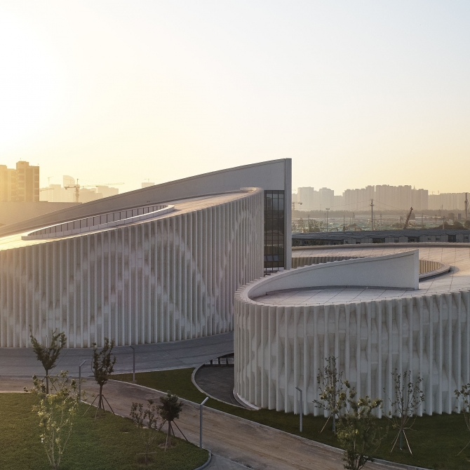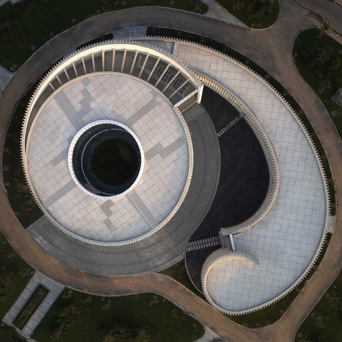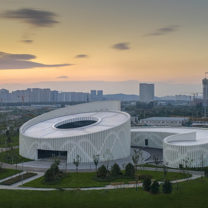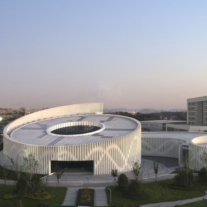 山東第一醫(yī)科大學(xué)醫(yī)學(xué)博物館呈現(xiàn)一種簡單、靜謐,形式內(nèi)向而又富有活力和動感的建筑意向。它歡迎人們進入、感受生命的神奇。高低起伏、螺旋向上的層次感帶來豐富的空間感受,同時這種向上的狀態(tài)似乎在傳達生命積極向上的姿態(tài)、講述生命的力量。同時,曲線的建筑姿態(tài)呈現(xiàn)一種柔美的空間形態(tài),與螺旋向上的建筑立面相結(jié)合。我們希望傳達的是生命的柔與剛、靜與動、矛盾與和諧。