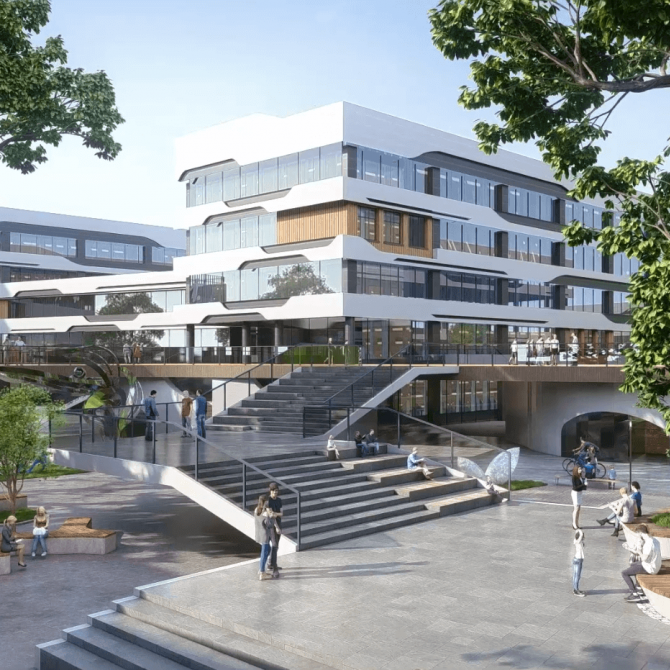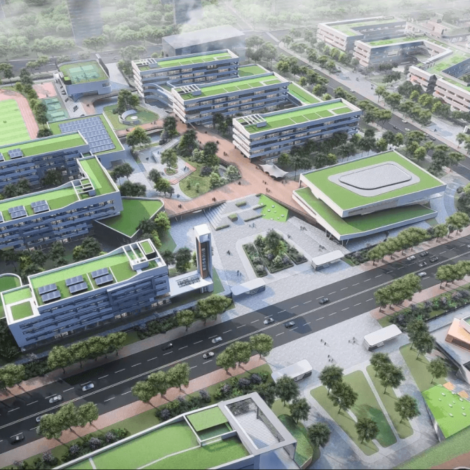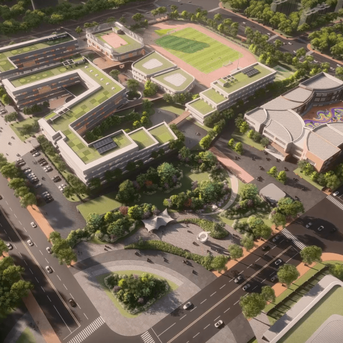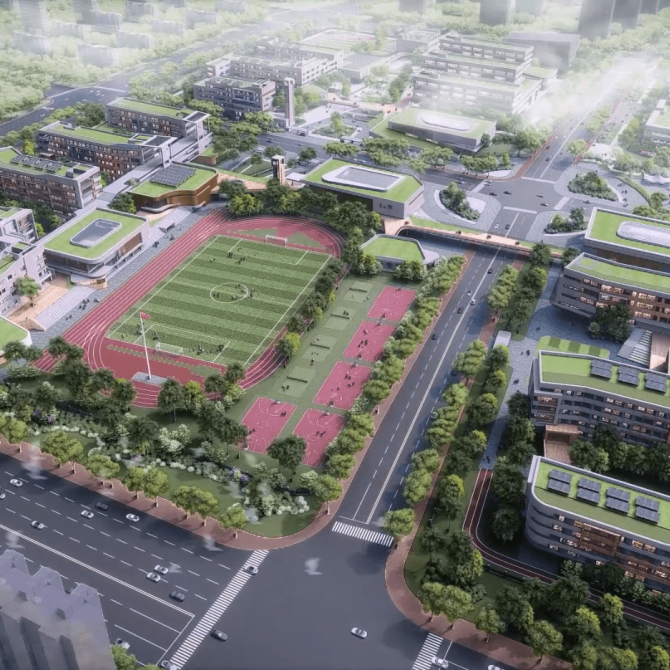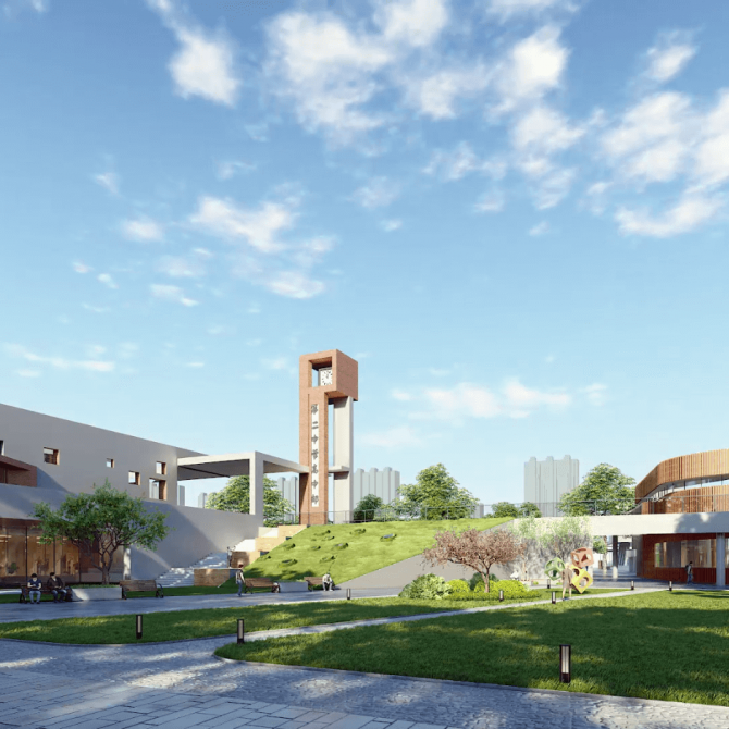 設計方案響應石家莊市“以走在前列的標準推動教育高質量發展”要求、構建高水平教育集群,旨在打造一個面向未來教育;強調教育特色與設施共享;綠色生態可持續的新型校園。