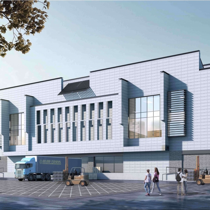 相較于其他冷鏈物流項(xiàng)目,本項(xiàng)目規(guī)模適中,業(yè)態(tài)種類全面。包含冷庫、常溫庫、食品加工、第三方物流、農(nóng)貿(mào)市場、配套辦公及公寓等多種功能。方案結(jié)合場地設(shè)計(jì),將商業(yè)功能和物流功能按東西兩側(cè)分別集中布置,功能相對集約。東西向的交通軸線聯(lián)系兩個(gè)功能區(qū),實(shí)現(xiàn)一種“前店后廠”的經(jīng)營模式。同時(shí)布局上充分考慮北側(cè)主干路的沿街展示效果,打造起伏的城市天際線,增強(qiáng)園區(qū)的標(biāo)識性。