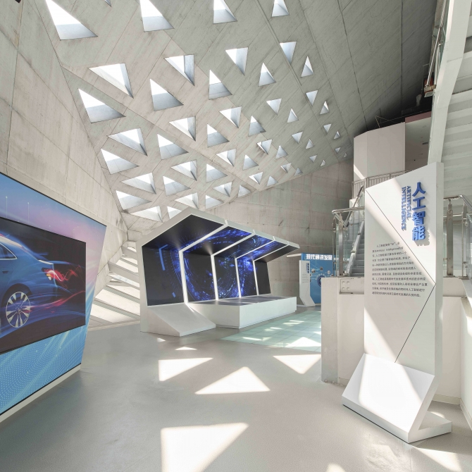 場地規(guī)劃布局延續(xù)上位規(guī)劃的對稱格局,建筑以中軸線為核心呈扇形展開,東側布置圖書館和科技館,西側布置文化藝術館、檔案館和青少年活動中心。在東、西、南、北四個方向分別設置開放空間,呈現不同的主題:北面設置較為開闊的群眾活動廣場,便于容納群眾性集體活動;南面沿湖面設置形態(tài)自由、綠化豐富的生態(tài)廣場,作為主要的市民休閑觀景場所;場地西側設置以抽象藝術景觀為主的藝術廣場與文化藝術館和檔案館、青少年活動中心相對應;東側設置以理性景觀為主的科技廣場與科技館和圖書館配套。