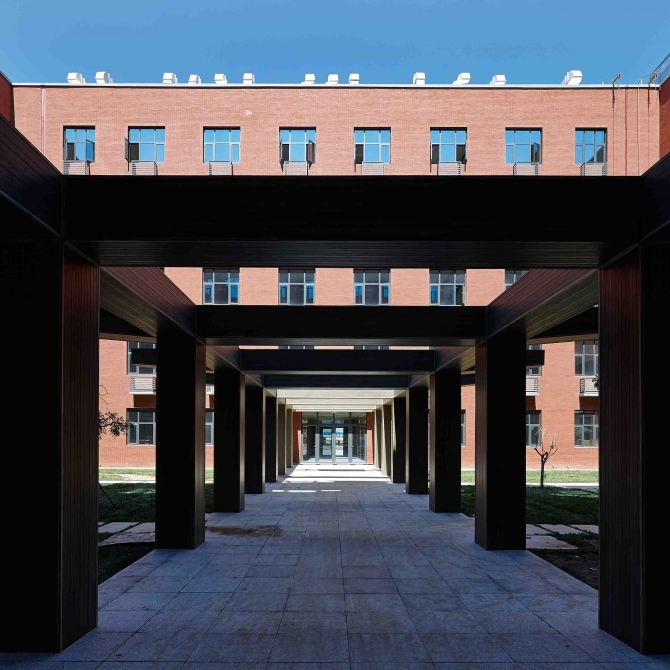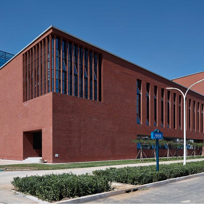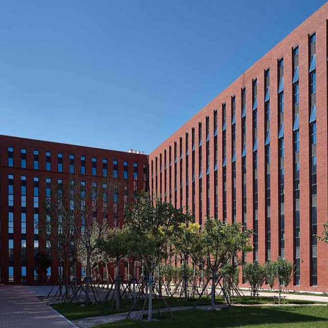 化工材料教學組團對天津大學衛津路校區的建筑有一定的傳承,風格穩健大氣;同時又處理得相當簡練,以豎直線條作為母題貫穿始終,簡潔現代。該項目在整個校園規劃體現了以學生活動和學生生活為中心的總體思想,一個具有人文氣息的、可持續發展的、綠色低碳的、面向未來的新型校園