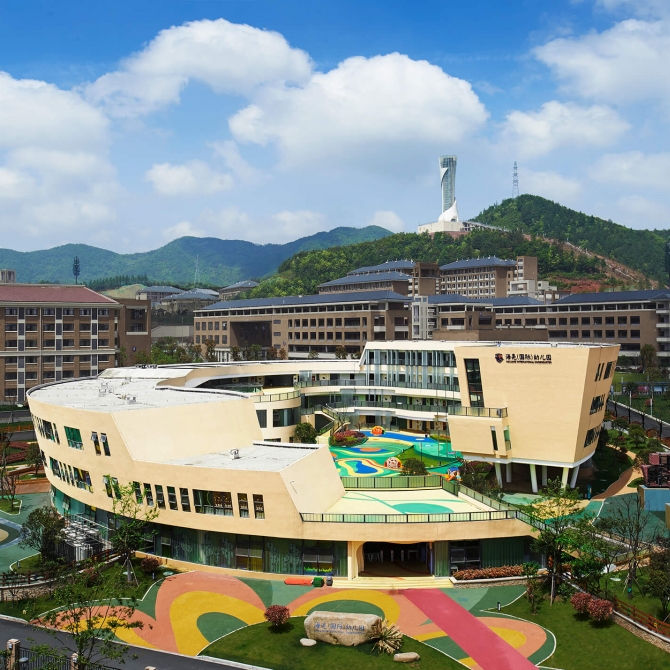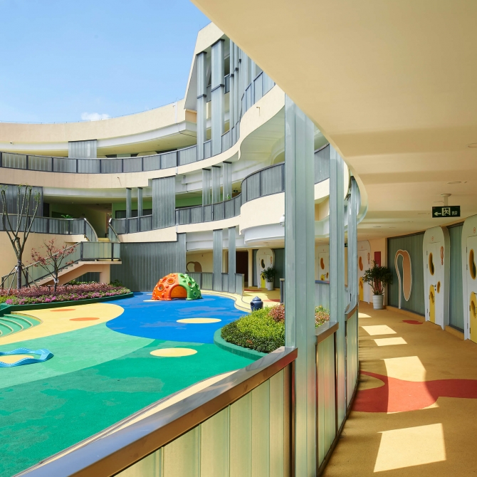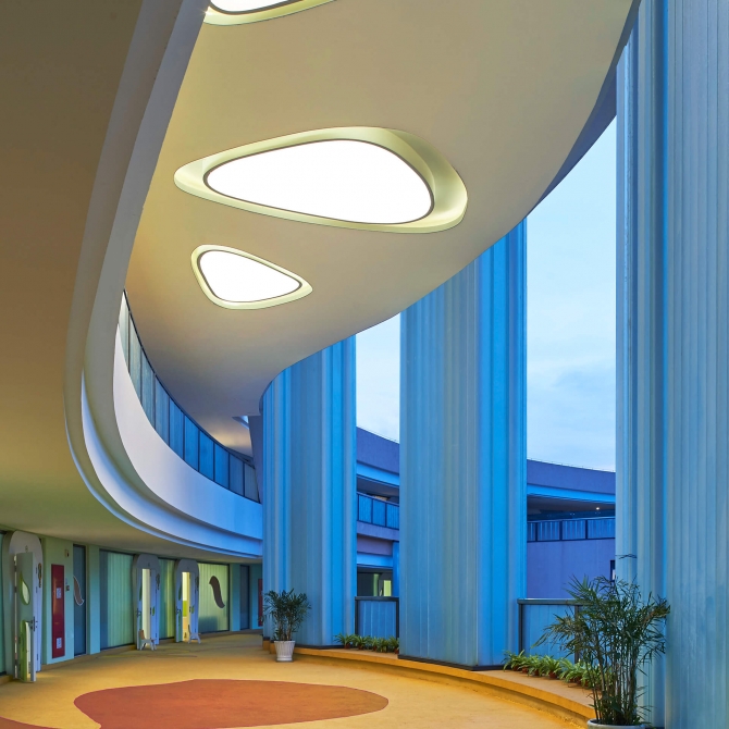 海亮國際幼兒園是一座大型寄宿制幼兒園,設(shè)計可容納500名兒童。設(shè)計基于對幼兒心理安全性與趣味性需求進行充分的響應(yīng),并關(guān)注獨特復(fù)雜地域環(huán)境的場地因素,以兒童的視角和兒童的體驗為原始出發(fā)點,以簡約而豐富的設(shè)計手法,力求創(chuàng)造出一個真正為兒童所喜愛的、歡樂的、安全的、并且充滿趣味的空間場所。