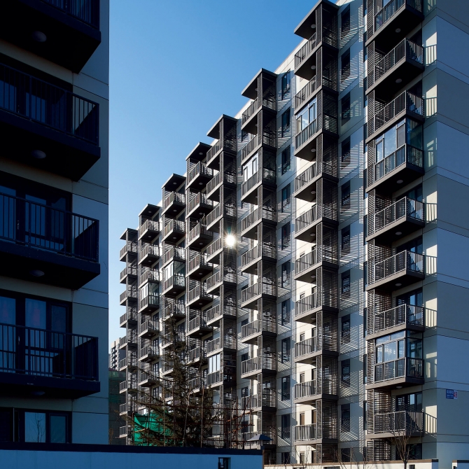 項目包括3棟11層板式工業(yè)化小高層住宅,環(huán)繞組團中心綠地布置。板式高層住宅間距按照遠大于建筑高度的1.5倍考慮。組團兩個入口均設置在用地西側連接小區(qū)機動車道。由于其中1棟采用東西向布局,使得用地變得寬敞,住宅樓之間圍合著4200平方米的步行環(huán)境空間,并布置了方整的2100平方米集中綠地,形成了安靜、安全、親切的戶外活動空間。