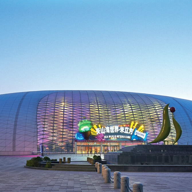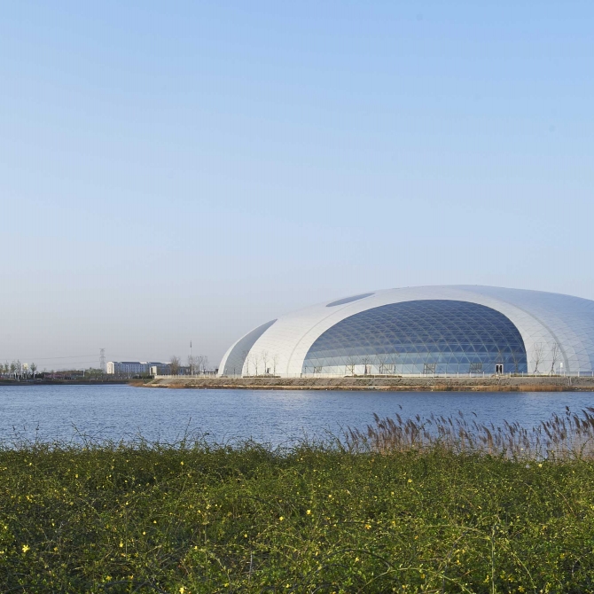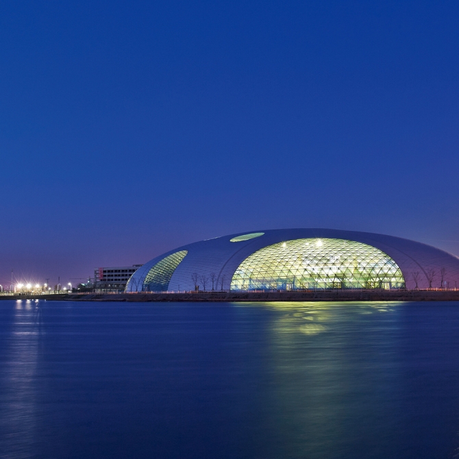 外觀設計理念源于馳名中外的“小站稻”,體現晶瑩剔透,純靜亮麗的意境;設計采用橢圓形半球體的造型,覆蓋開放式的鋁合金裝飾板屋蓋和浮點式透光玻璃相結合的外表皮,潤澤圓華;具有強烈的地標性建筑特色。