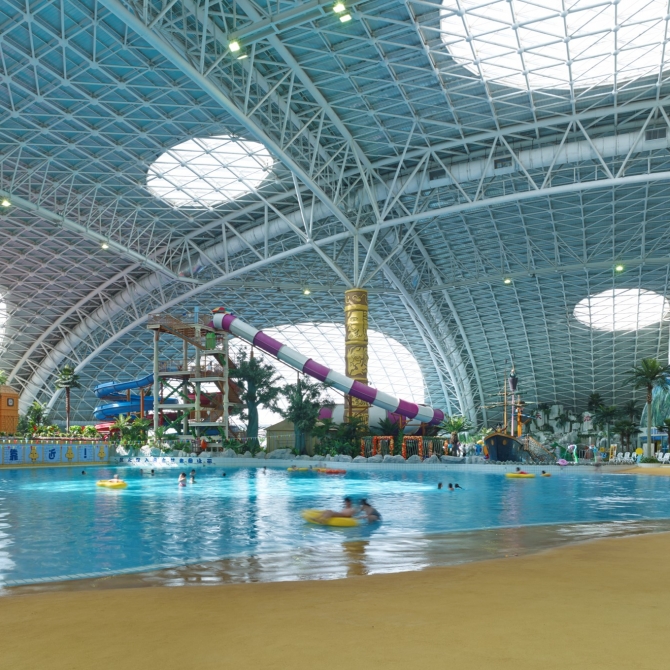 設計實現了把所有水上游樂及服務設施的主要功能空間置于一個完整的建筑體量內,又做到干區和濕區明確分隔的理想追求。渾然一體的橢圓形半球體造型,平地而升,宛若自水中浮起;結構體系提采用了新型復合空間網格鋼結構,即弦支桁架拱-單層網殼結構體系,在結構正交兩個方向各布置兩道弦支拱桁架,拱桁架支承在大體積混凝土承臺上,單層網殼支承于混凝土環梁和弦支拱桁架上,環梁支承在下部承臺上,八個拱腳之間設置井字形四道拉索。