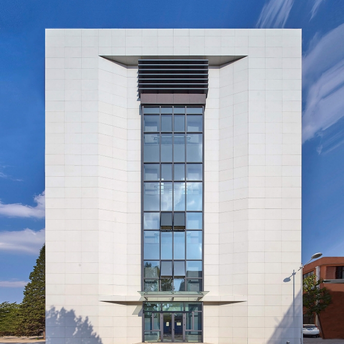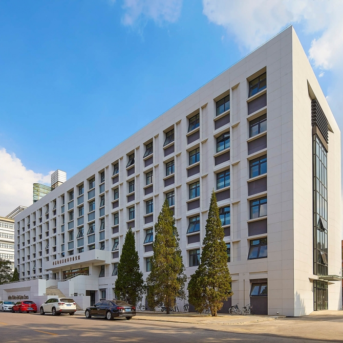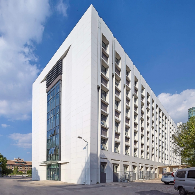 由于此項目位于天津大學老校區核心地段,通過北洋廣場與第九行政辦公樓遙相呼應。九樓作為天津大學老校區的經典,為世人所熟知,它也是天津大學對外宣傳的一張名片。老校區由東門而入的一個景觀長軸,分為南北兩部分。北部是以九樓為代表的磚栗色中國古典樣式建筑群,南側則是乳白色的現代建筑組團。地科院的改造契合這一校園文脈,采用了乳白色的12mm厚埃特水泥纖維板外飾幕墻。在盡量保留原有建筑格局的基礎上,運用橫豎有序的建構手法,通過減小原窗面積節約能源,通過加大窗口的進深達到多變的雕塑效果。傾斜的內窗口加之埃特板上有一些凹槽及點綴裝飾設計,使得外檐效果豐富多彩,整潔理性的建筑表情與第九行政樓完成了時空對話,加強了中心校區的凝聚力。
