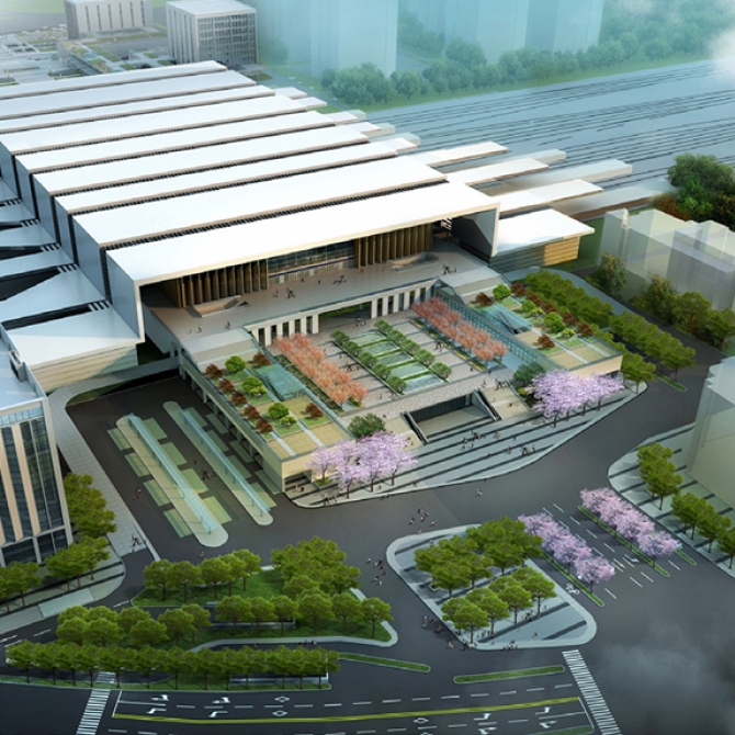 國鐵車站作為城市景觀軸的焦點,由國鐵站房東廣場及西廣場向東向西延伸成城市綠軸,廣場上方布置綠化平臺,成為城市中心的綠肺,
