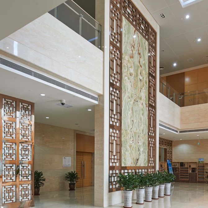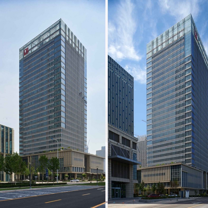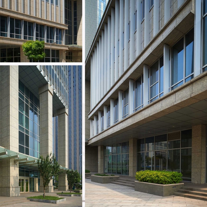用于基地呈不規則形狀,為保證建筑退線與周邊道路相互平行,建筑主要平面呈平行四邊形,設計在經濟合理的原則上,盡可能地增加有效使用面積。建筑外觀以淺灰色鋁板與玻璃為主要建筑材料,錯落有致的構件排布反映了自然山水的天然紋理,使沿河的建筑形象更加生動活潑。本項目建成后已經成為響螺灣商務區重要的標志性建筑。