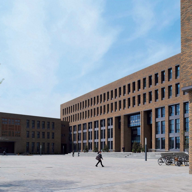 建筑與整體校園規(guī)劃融為一個整體,強化校園核心空間,營造穩(wěn)重、寧靜、質樸的校園整體氛圍。以城市設計的方法構建限定明確、比例恰當、適合師生活動的積極外部公共空間。