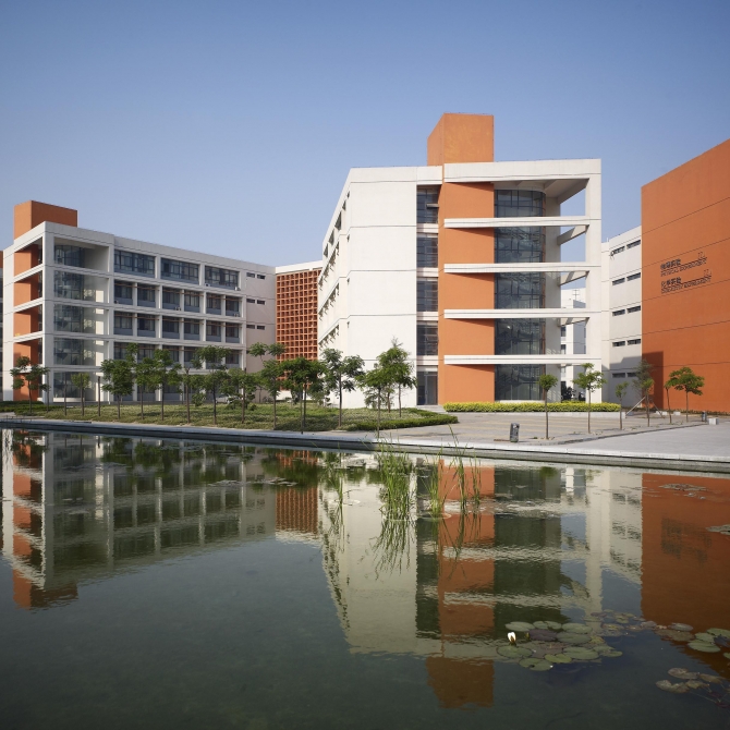 依據現今教育模式發生的變化,實現資源共享,對各種教學用房進行更新組織和歸類,將建筑群整合為三個主要組團。運用景觀軸線的關系和連廊等空間元素將三組建筑在視覺上既連為整體而功能上又相對獨立,形成一組組極富邏輯性的建筑群體,使之成為真正意義上的教育綜合體。