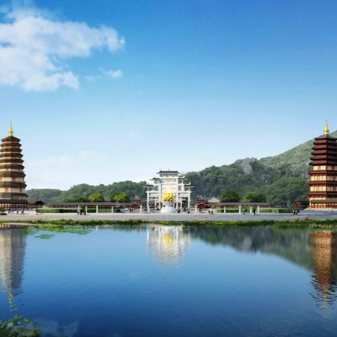 湖區主要包括鳳鳴湖和湖上六座水上平臺,取菩提葉意向,“一花一世界,一葉一菩提”。
