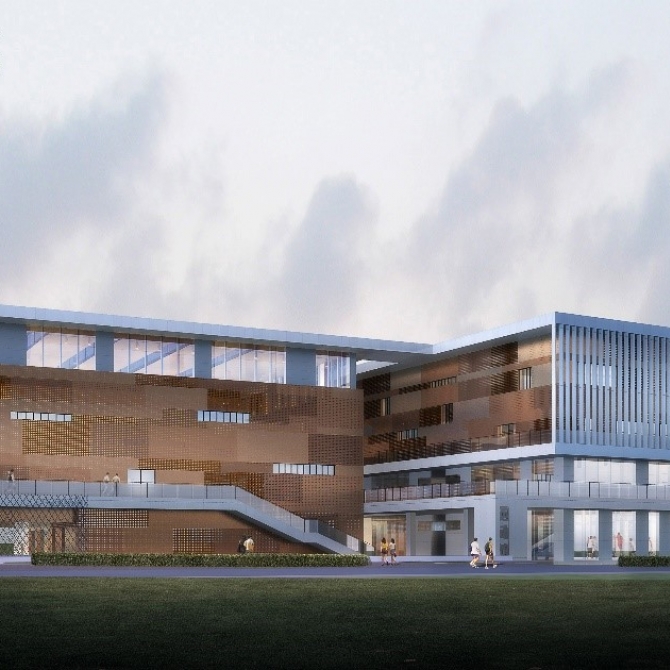 建筑通過體塊的交錯與鑲嵌,體現出體育場館的力量感,立面上以及屋面條形輪廓使建筑顯得規整統一。外立面材料以灰色鋁板幕墻以及孔徑不同的棕紅色系鋁板幕墻為主。穿孔板以孔徑大小和板材顏色深淺做退暈變化,以凸顯運動的動感和韻律。