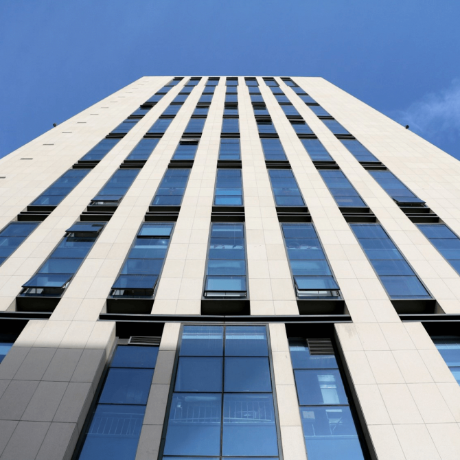 造型整體強(qiáng)化豎向節(jié)奏,裙房三層寬而細(xì)長(zhǎng)的矩形長(zhǎng)窗,逐漸向上收縮成纖細(xì)且有韻律感的長(zhǎng)窗矩陣,在頂部逐層遞退,形成塔式收束,沖天而上之感油然而生。
