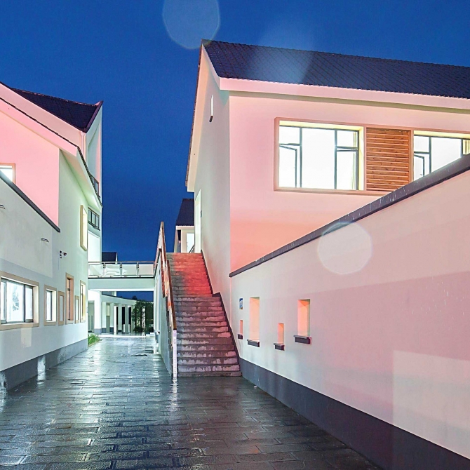 主要包括綜合服務中心和小學(含幼兒園),設計均采取化整為零的方法,通過體量打散使建筑尺度和布局肌理接近于臨近的聚落組團,尺度宜人的檐下、外廊及庭院空間,為使用者提供游憩與交流的場所。立面取自傳統(tǒng)民居風格,開窗兼顧功能需要與景觀視線,墻面采用實用經(jīng)濟的淺色涂料,屋頂采取與農(nóng)宅相同的深黑色釉面瓦。室外景觀尊重現(xiàn)有地形,盡量采用地方材料和植被,模擬自然的梯田景觀,使建筑同鄉(xiāng)村環(huán)境自然地融為一體。