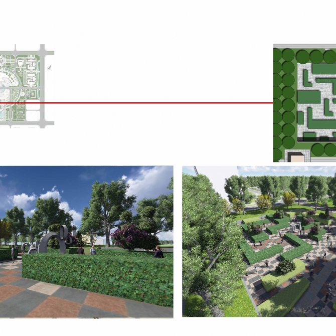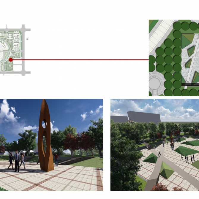 設計延續上層規劃中“天圓地方”“負陰抱陽”“前庭后院”的設計構思,總體布局上以一條中軸線連貫三個廣場,分別以五行、玉璧、鏡湖賦予景觀內涵。廣場南部兩側園林綠化內以新鄉縣歷史悠久的“新鄉八景”為題材,設計現代景觀下沉庭院。廣場東、西入口處塑造新鄉古老的倉頡文化教育園,五行廣場、玉璧廣場、鏡湖廣場、倉頡庭院和八景庭園共同打造融歷史傳承與地區文脈為一身、喻教于景的新時代市民活動廣場景觀。