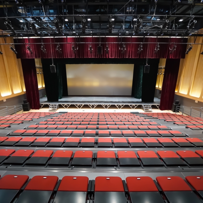 大劇院由兩個劇場組成,主劇場可容納1203人,小劇場可容納500人,完全按照國際建筑聲學原理進行設計裝飾。