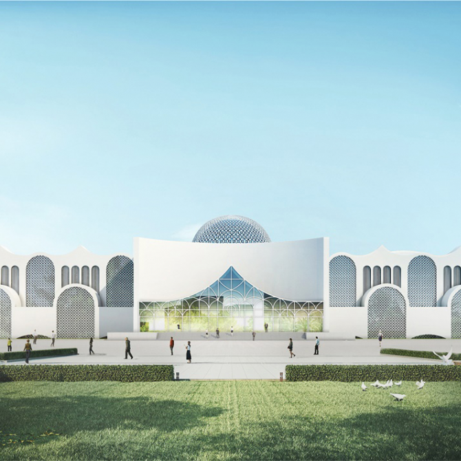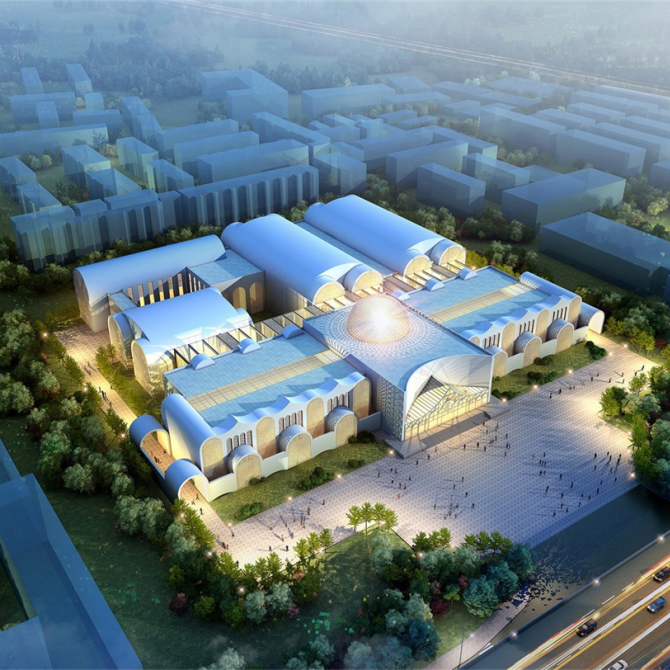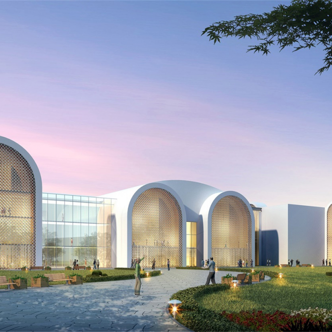 博物館創(chuàng)意取材于新疆特有的地域民族文化符號,將原有建筑立面加以簡單改造,通過透明綠化的中央共享大廳將新老建筑無縫相連。充滿現(xiàn)代活力氣息的白色建筑展現(xiàn)出源于西域民族特色和地域文化獨有的特殊美感。通過圓拱和尖圈的前后交織,左右錯動,形成極具樂感韻律的立面造型,構(gòu)成建筑的多重性格。