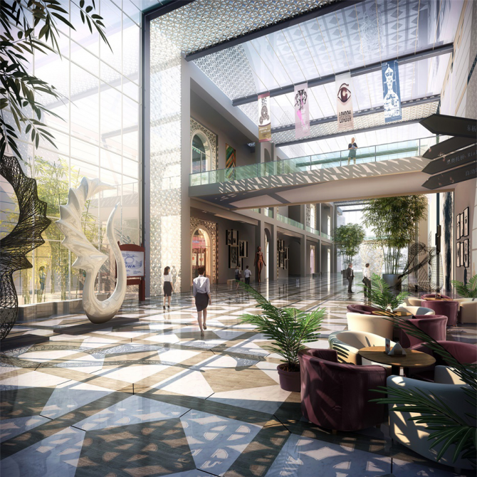 利用建筑造型,打造高低錯落的剖面形態(tài)。各個展廳圍繞中心綠色共享大廳展開,通過一系列連續(xù)的拱形門洞,形成特有的框景、透景的藝術(shù)效果,為參觀者打造步移景異、收放有序的觀展空間。