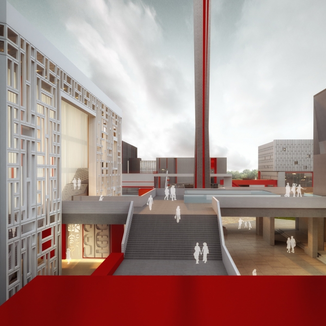 文化建筑包括市民文化交流中心、群眾藝術(shù)中心、科技館、檔案館(四館合建)。整個文化建筑仿佛綻放的花朵,呼應(yīng)了“魯西名城 盛世綻放”的設(shè)計主題。各場館錯落而建,地下車庫分別設(shè)置各文化建筑的地下門廳,方便直達(dá)各個場館。