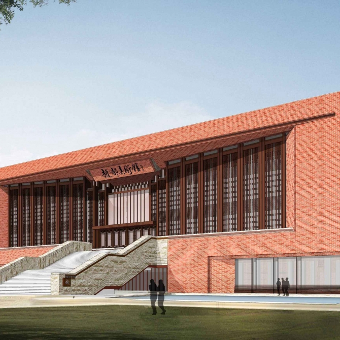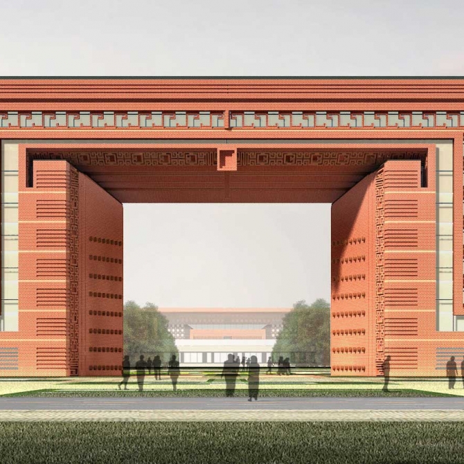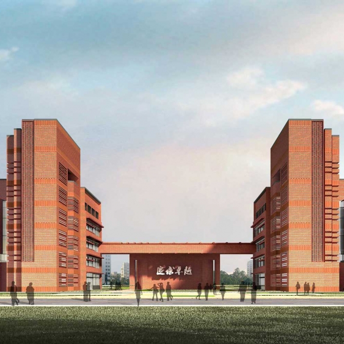 設(shè)計(jì)創(chuàng)新地提出了“躍龍門”的規(guī)劃布局模式。由行政辦公和實(shí)驗(yàn)樓共同形成校園入口主體大樓,并與圖書館、風(fēng)雨操場共同圍合出校園的主入口,打造了一個(gè)吉祥大氣校園主入口空間。學(xué)生經(jīng)過鯉池,穿過龍門完成升華,取自“魚躍龍門”的吉祥寓意。在大氣中彰顯浪漫情懷,在傳統(tǒng)中展露現(xiàn)代風(fēng)采。