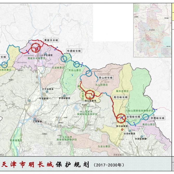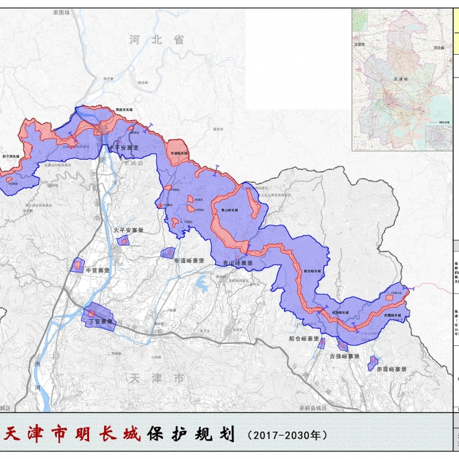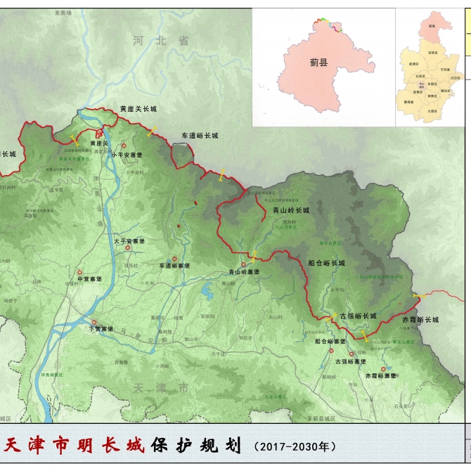 天津市境內明長城全長40.28公里,全國長城分布最短的省市,屬地一脈相承,集中分布于天津市薊州區下營鎮北部山區。天津市明長城所在薊州鎮是京畿所在,長城建筑遺存豐富,且防御體系完善,在長城所在城市中富有特點,是明長城防御體系一個具體而微的代表。