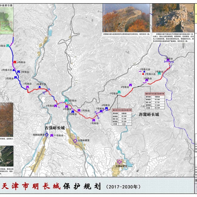 規劃以長城價值為引領,確定保護對象,對長城本體保存現狀、病害、管理、地質災害等現狀進行專項評估。保護規劃方面,主要是結合GIS完成山地保護區劃的劃定工作、探討長城寨堡的合理保護方式以及在文物活化利用的大背景下,規劃提煉天津長城價值闡釋的三大核心主題,綜合確定重點段落的分級分類。