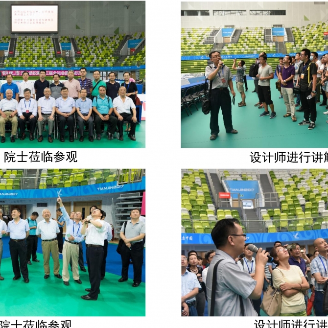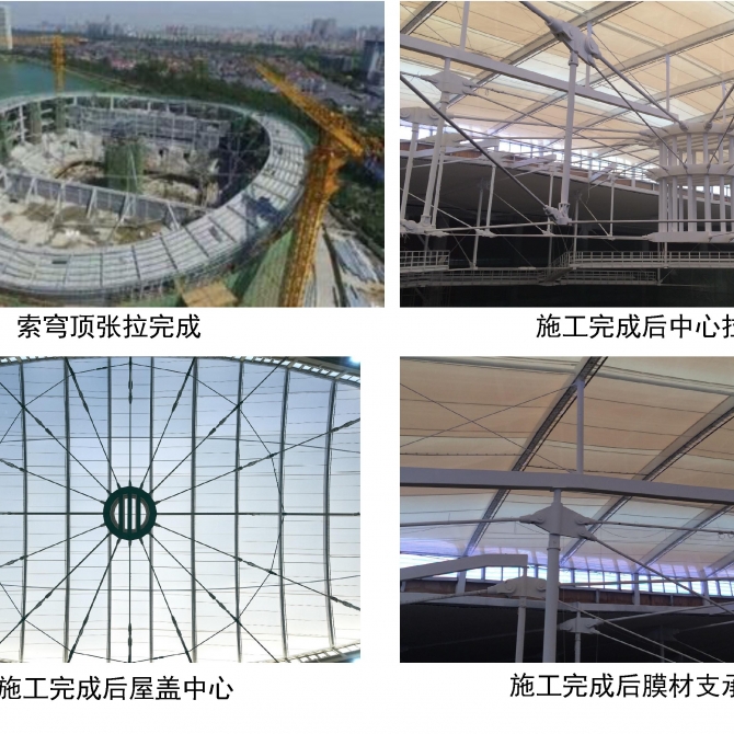 天津理工大學體育館主體結構采用鋼筋混凝土框架,屋蓋平面投影為橢圓形,長軸102米,短軸82,通過方案對比分析,屋蓋采用外圈Levy、內圈Geiger的新型復合式索穹頂結構,索穹頂周圈錨固于混凝土環梁,環梁呈馬鞍形,短軸為最高點,長軸為最低點,最高點和最低點高差5.455米,該項目是目前國內建成跨度最大的復合式索穹頂結構。