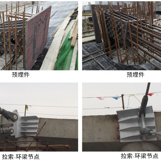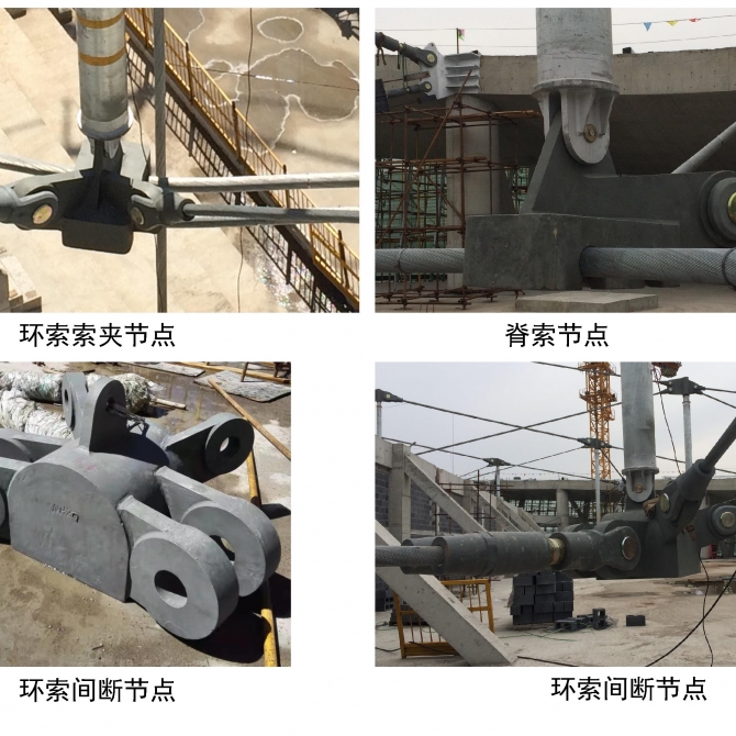 由于本工程屋蓋失跨比較小、拉索預應力較大,拉索預埋件除了隔板與肋板外還在肋板外側設置栓釘,在隔板后部設置了尾鋼筋以保證預埋件與混凝土環梁間的可靠連接。撐桿上節點連接脊索、斜索和撐桿,由于脊索彎折角度與索力差異均較大,因此脊索在撐桿上節點處均為間斷,由于交匯桿件多且角度各異,撐桿上節點采用鑄鋼節點。環索節點連接撐桿下端與環索和斜索,為了保證環索連續,采用鑄鋼索夾節點。