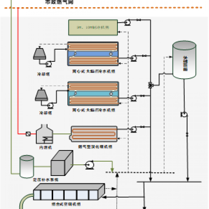 本項目為國家重點研發計劃“多能互補集成優化的分布式能源系統示范”項目的配套項目,創新性的采用了燃氣三聯供、大型水蓄能、二級泵、能源互聯網、大數據、人工智能等關鍵技術來滿足園區內各廠房的冷、熱、電需求,通過不同能源子系統集成優化、協同調度,大幅降低了園區能源系統的初投資、運行費用和維護成本。