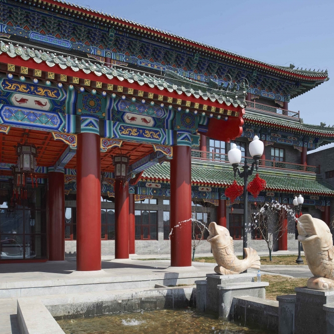 正中間為三層廡殿建筑,兩邊為兩層硬山建筑,形態平和,形式舒展,最兩端為三層歇山,是整個建筑的有力結尾。建筑沿街布置,圍合出多個完整的內庭院,并利用建筑自身的形體變化,制造出“移步易景”的景觀效果。建筑外延采用中國古典建筑風格,灰磚、青瓦、古紅色木窗格,使整個建筑體現出了中國古建筑的穩重、典雅、洗練、大氣。